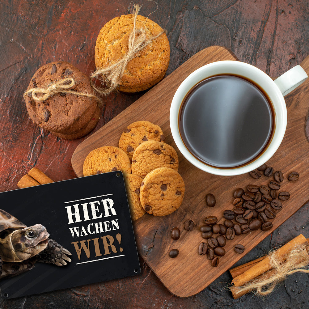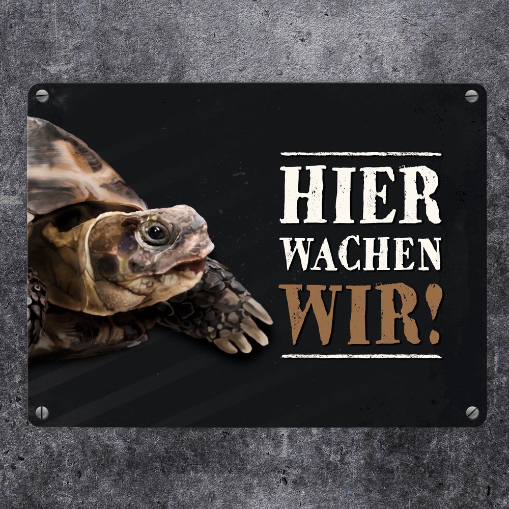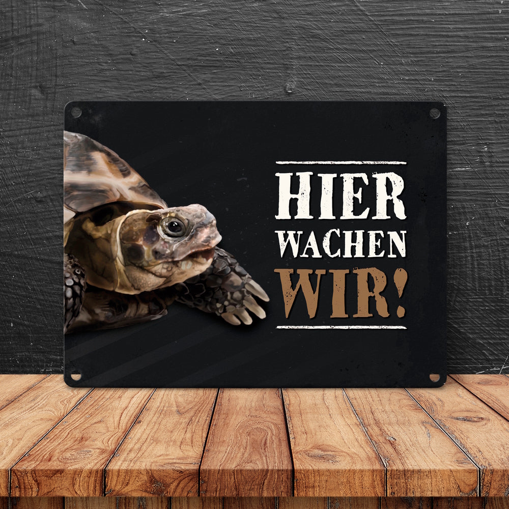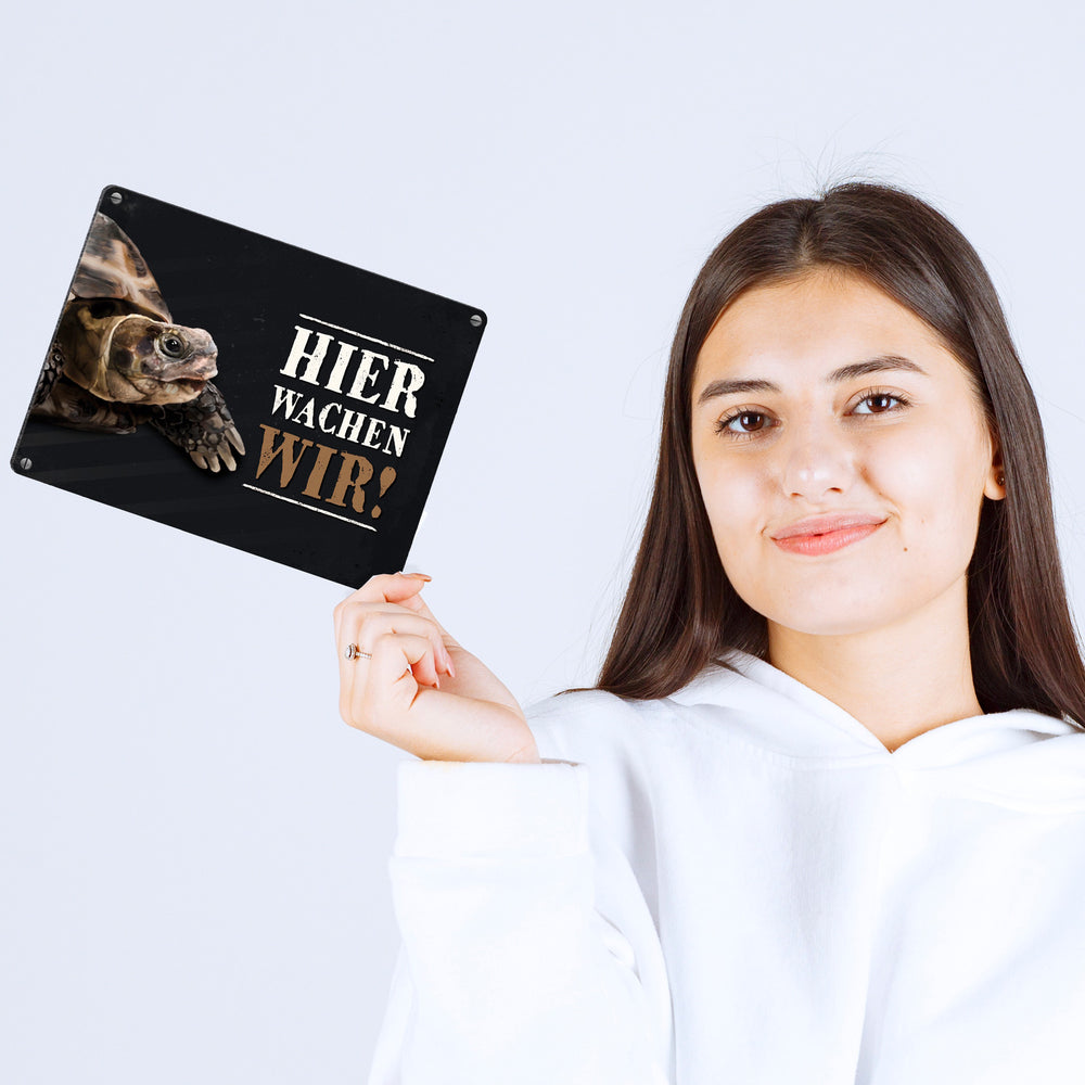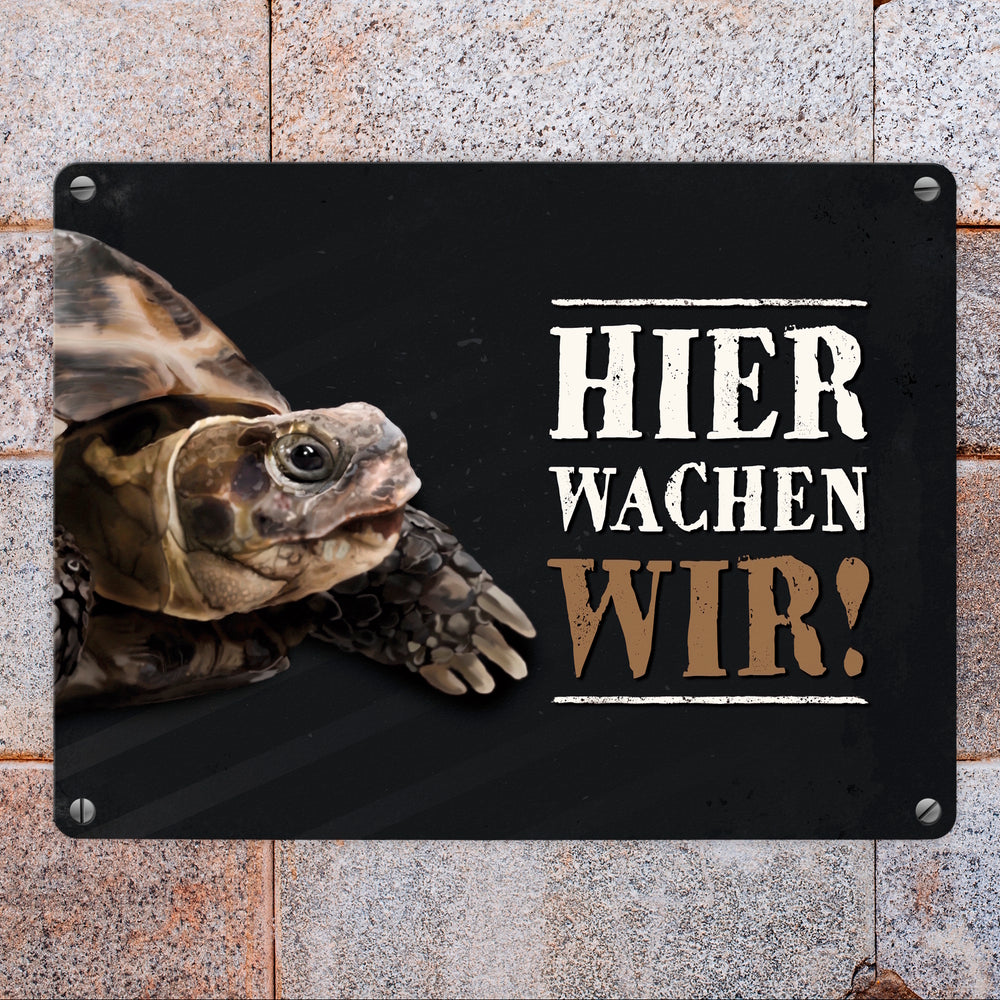 • 1x Metallschild mit Schildkröte Motiv und Spruch: Hier wachen wir! in der gewählten Größe