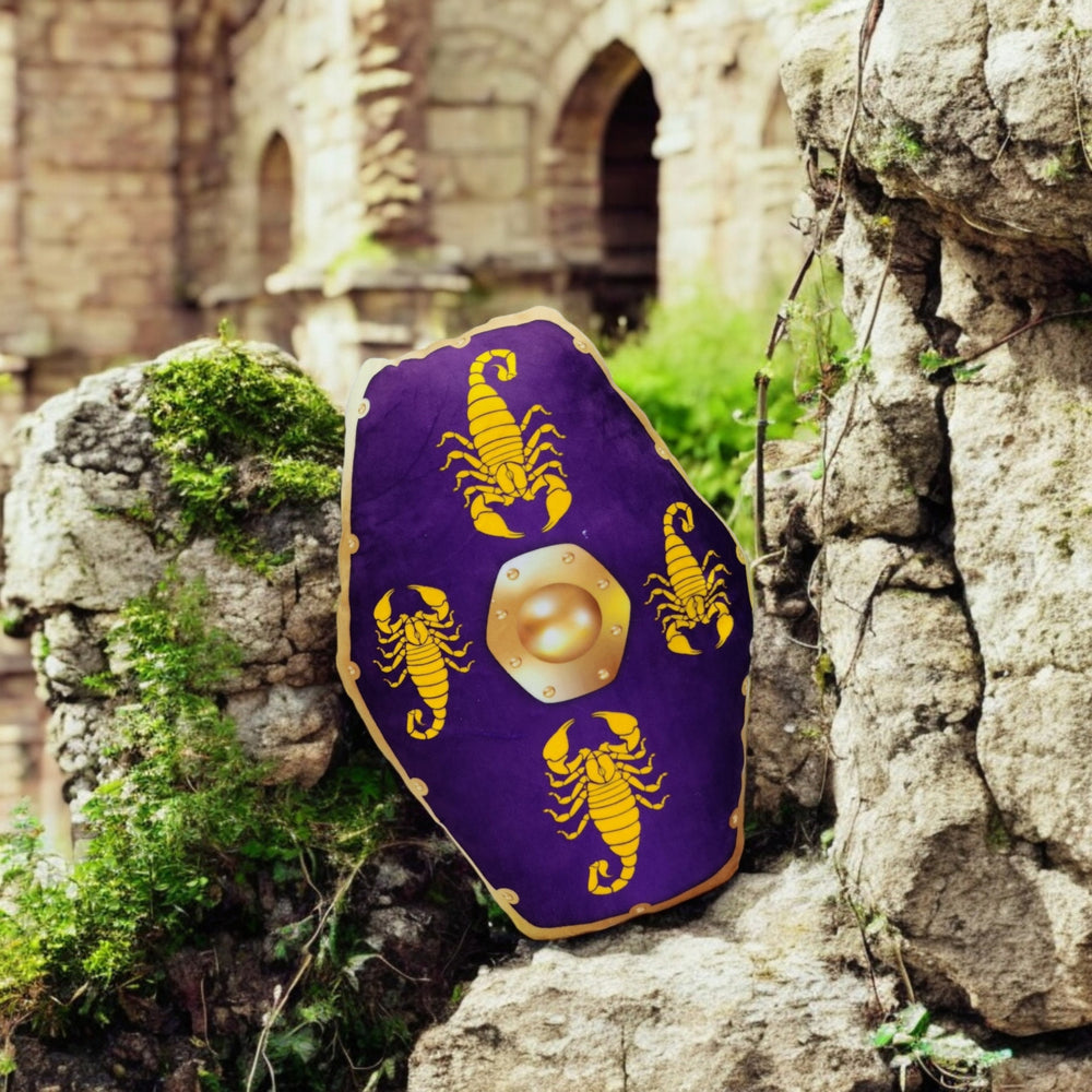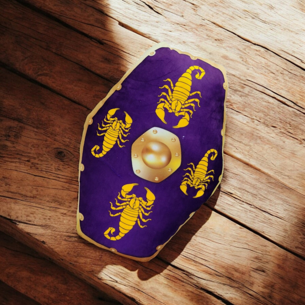 - Dieses Kissen besticht durch sein einzigartiges Design: Ein authentisches römisches Prätorianer Schild mit goldenen Skorpionen auf lilafarbenem Hintergrund. Die Rückseite ist hellbraun und verfügt über zwei Handgriffe, um es wie ein echtes Schild zu halten. Eine perfekte Mischung aus Deko und Spaß!