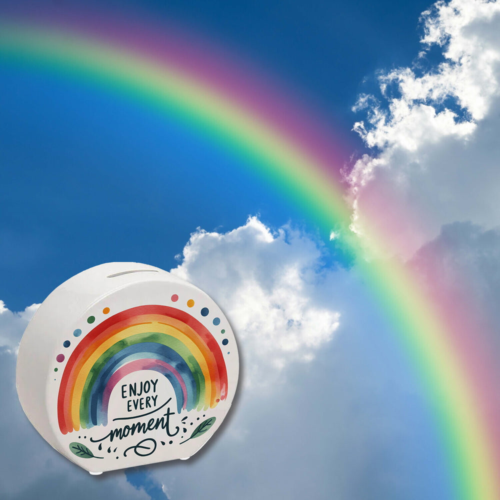 - ?? Warum grau sparen, wenn es auch bunt geht? Unsere Regenbogen-Spardose in strahlenden Farben Rot, Orange, Gelb und Grün bringt dir nicht nur gute Laune, sondern auch ein Lächeln ins Gesicht! Mit dem motivierenden Spruch "Enjoy every moment" zaubert sie dir jeden Tag ein Stückchen Freude. ??