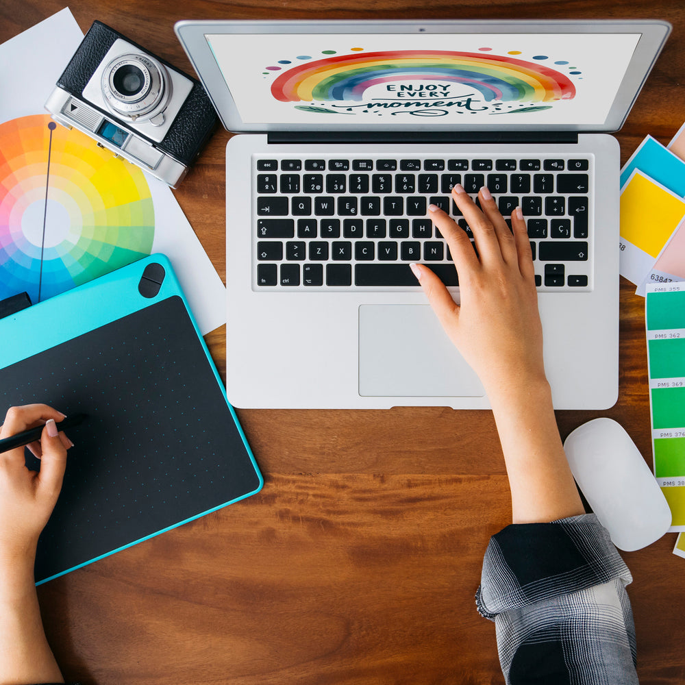 Regenbogen Kaffeebecher mit Spruch Enjoy every moment