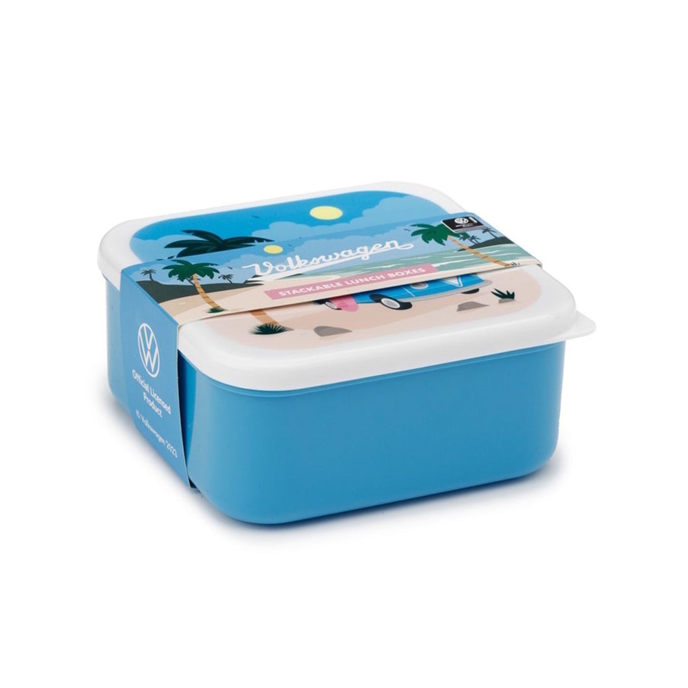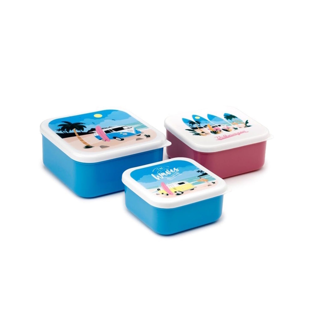 - Lieferumfang: 1x 3er Set Volkswagen VW T1 Bulli Vesperdosen. Bestehend aus 1x große blaue Box, 1x rosa Box und 1x kleine blaue Box.