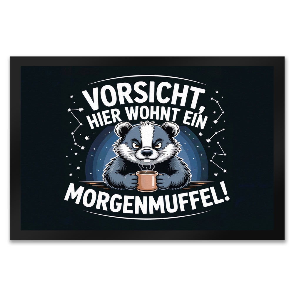 Vorsicht, hier wohnt ein Morgenmuffel! Fußmatte in 35x50 cm Dachs mit Kaffeebecher