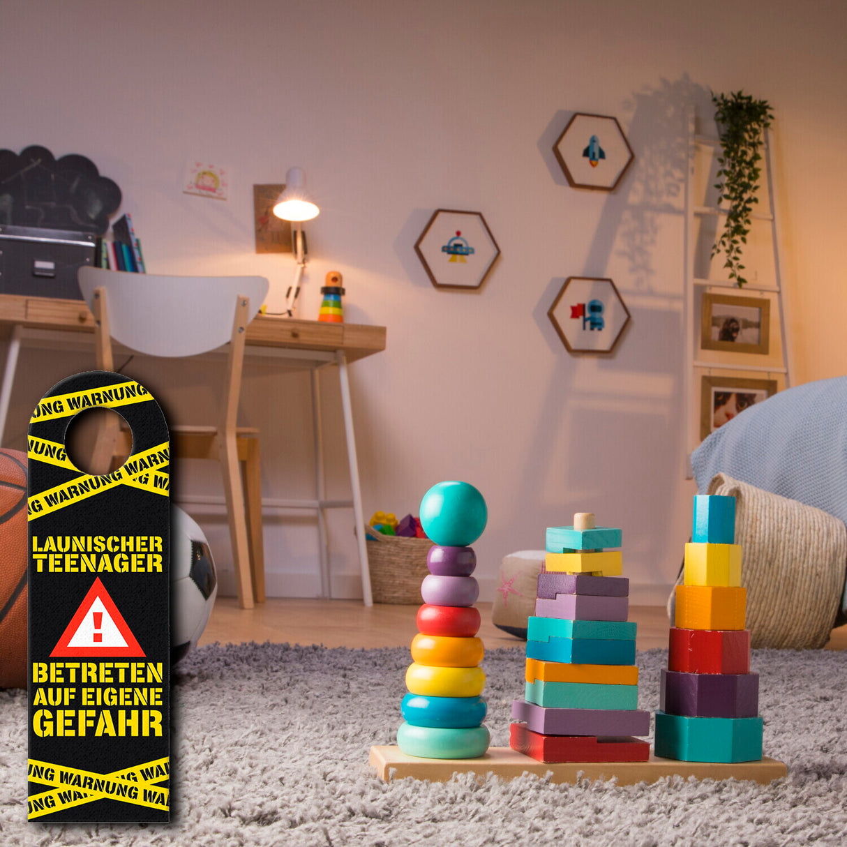 - Wenn man einen launischen Teenager etwas ärgern möchte oder ein humorvolles Geschenk machen will, dann eignet sich dieser Türhänger besonders gut. Er ist auch in jedem Haushalt eine tolle Warnung für alle, die das Zimmer des Jugendlichen betreten wollen.