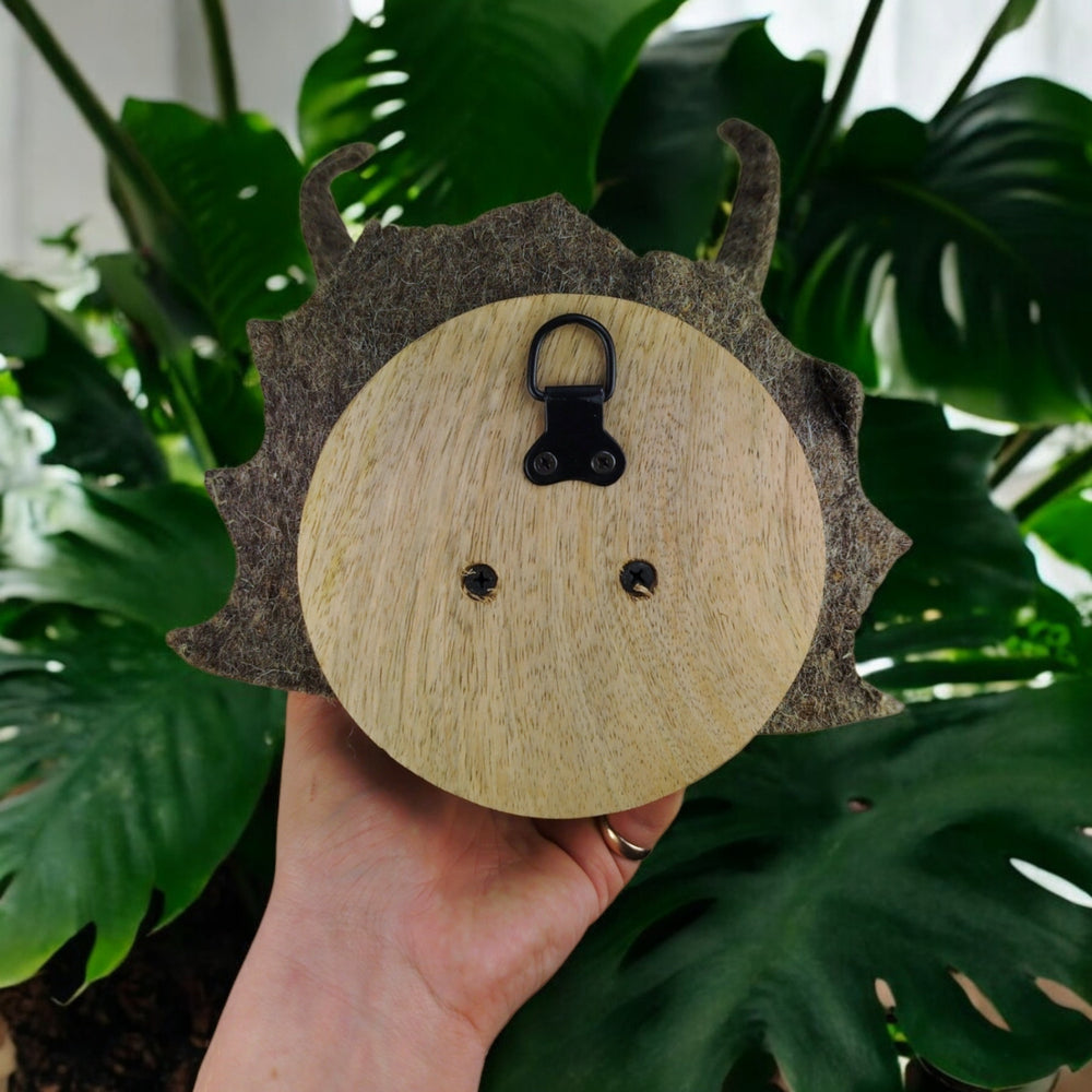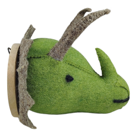 - Tobi, der Triceratops, besteht aus weicher Schafwolle in charmantem Olivgrün und thront majestätisch auf einem eleganten Holzbrett. Die beiden grauen Stirnhörner, das Nasenhorn und der markante Kragen machen ihn zu einem echten Hingucker. Dank der einfachen Aufhängung kann Tobi im Handumdrehen an Ihrer Wand Platz nehmen und für Abenteuerstimmung sorgen.