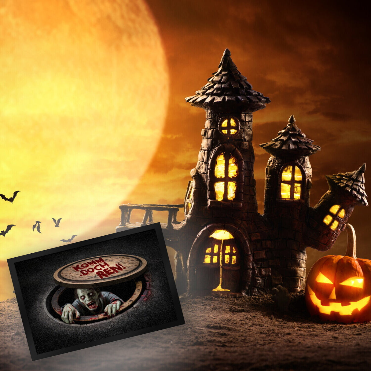 - Hier ist sie, die Fußmatte, die jeden Besucher schaudern lässt: Unsere "Zombie unter Kanaldeckel" Fußmatte! Diese gruselige Halloweendeko zeigt einen furchterregenden Zombie, der aus einem dunklen Schacht hervorlugt. Schwarz, böse und gefährlich – ein Must-Have für alle Halloween-Fans!