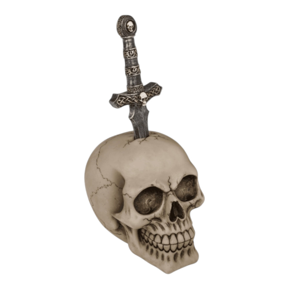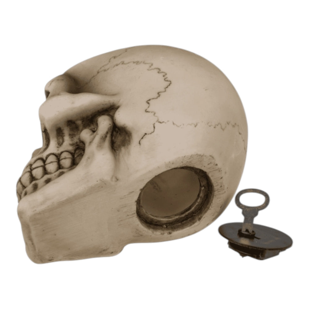 - Der beige Schädel fasziniert mit seinen dunklen Vertiefungen, die Zähne, Augenhöhlen und Risse dramatisch hervorheben. Das abnehmbare Schwert am Einwurfschlitz verleiht der Totenkopf Spardose einen heldenhaften Touch. Einfach, aber effektvoll: Münzen rein, Schwert drauf und dein Geld ist sicher!
