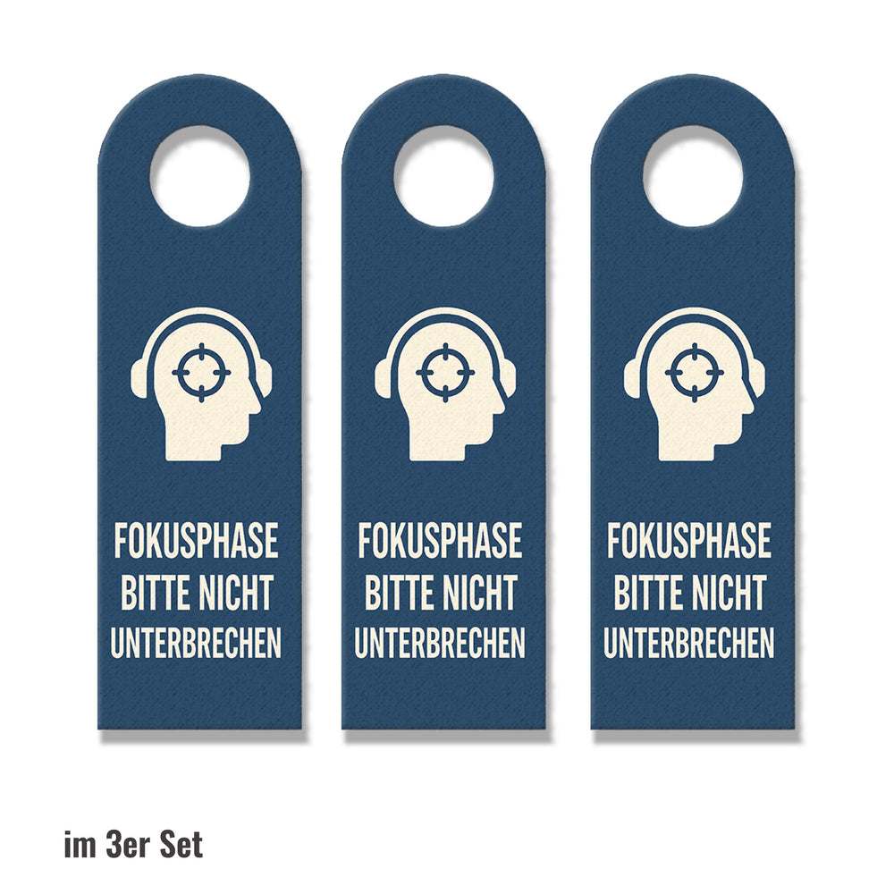 - Der Türhänger ist ein witziges Accessoire mit zwei Botschaften: Links zeigt ein dunkelblauer Hintergrund mit einem Kopf-Symbol und der Aufschrift "Fokusphase bitte nicht unterbrechen". Rechts strahlt ein hellblauer Hintergrund mit einem fröhlichen Gesicht und dem Text "Willkommen gerne eintreten". Perfekt für die Tür deines Büros!