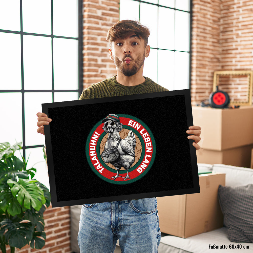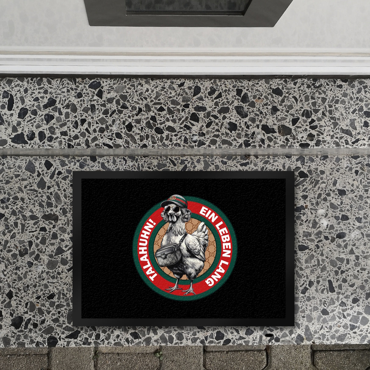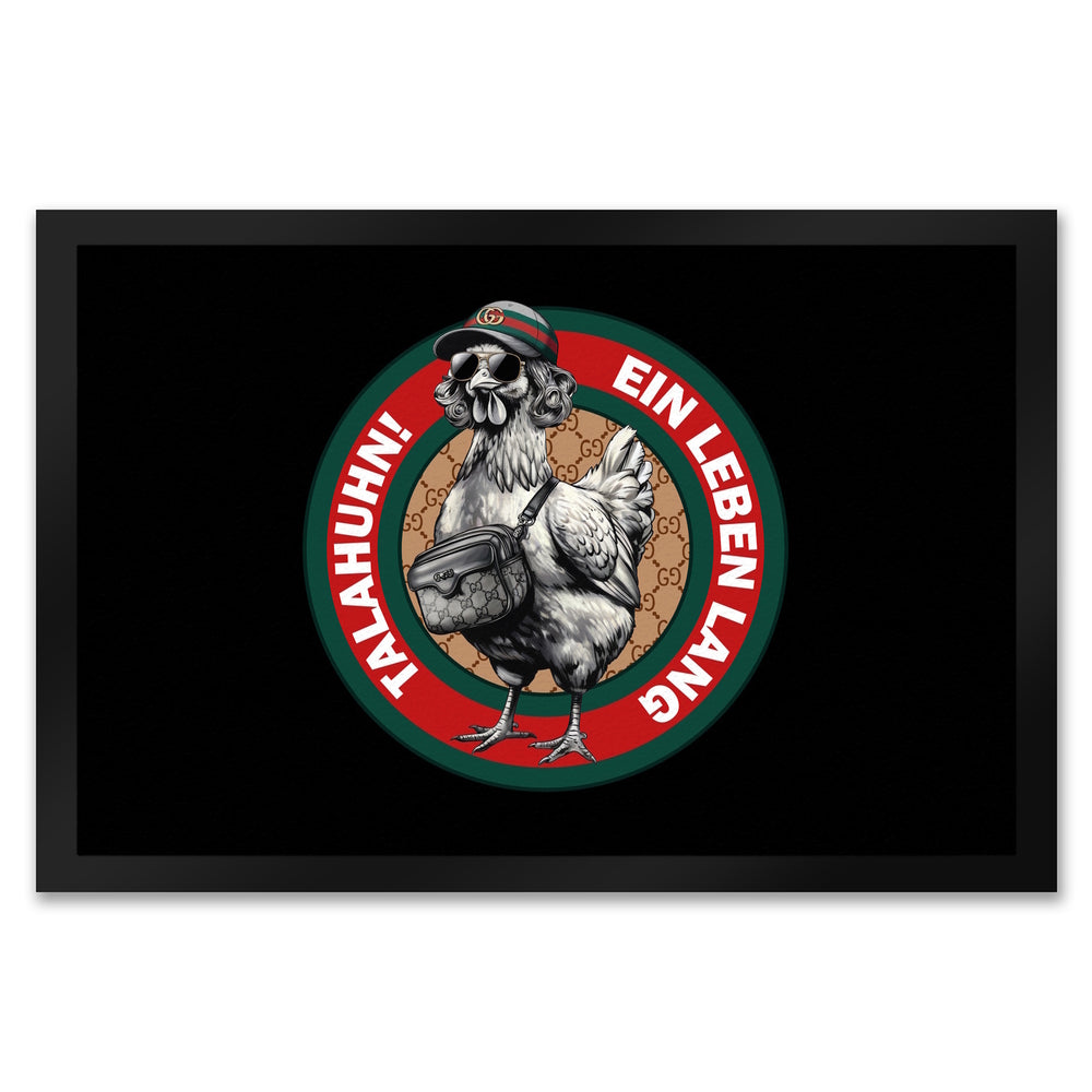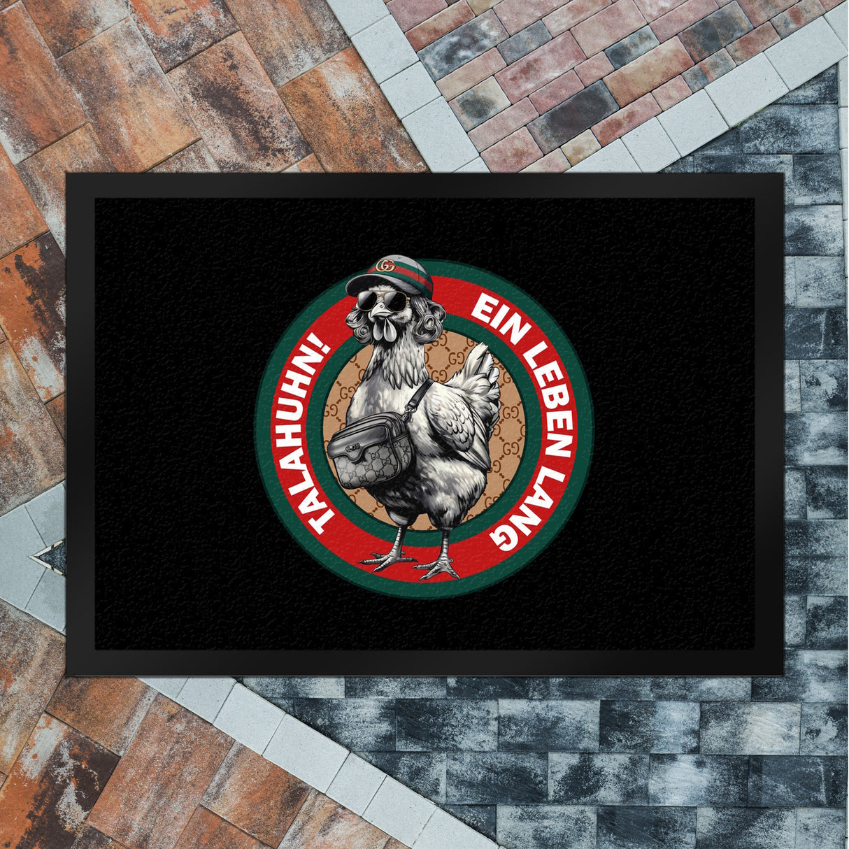 - Diese humorvolle Talahuhn Fußmatte ist ein echter Hingucker! Mit einem stylischen Huhn, das selbstbewusst mit Kappe, Sonnenbrille und Handtasche posiert, zieht sie alle Blicke auf sich. Der gemusterte Hintergrund mit dem Spruch 'TALAHUHN! EIN LEBEN LANG' verleiht der Matte eine verspielte und stilvolle Note.