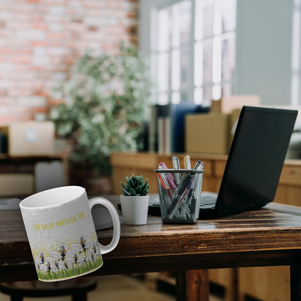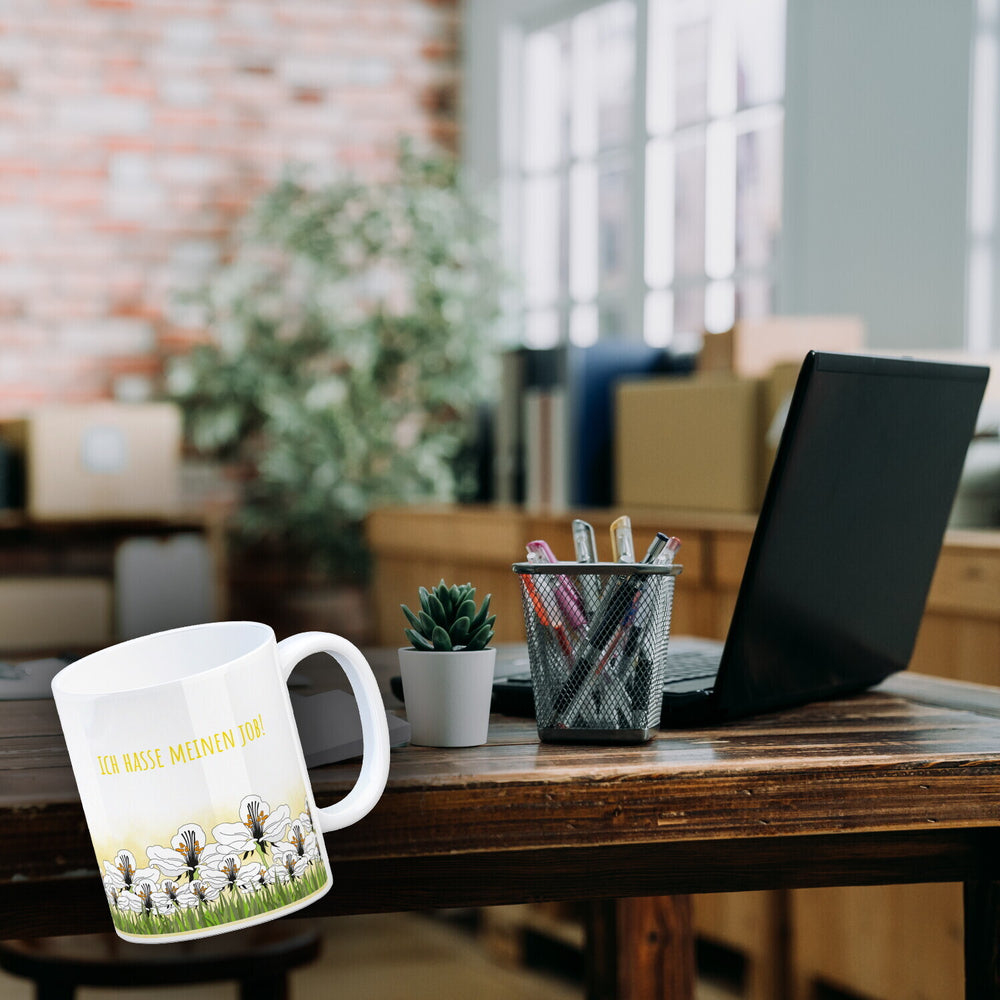 Kaffeebecher mit Wiesen-Motiv, Biene und witzigem Spruch fürs Büro oder Kollegen