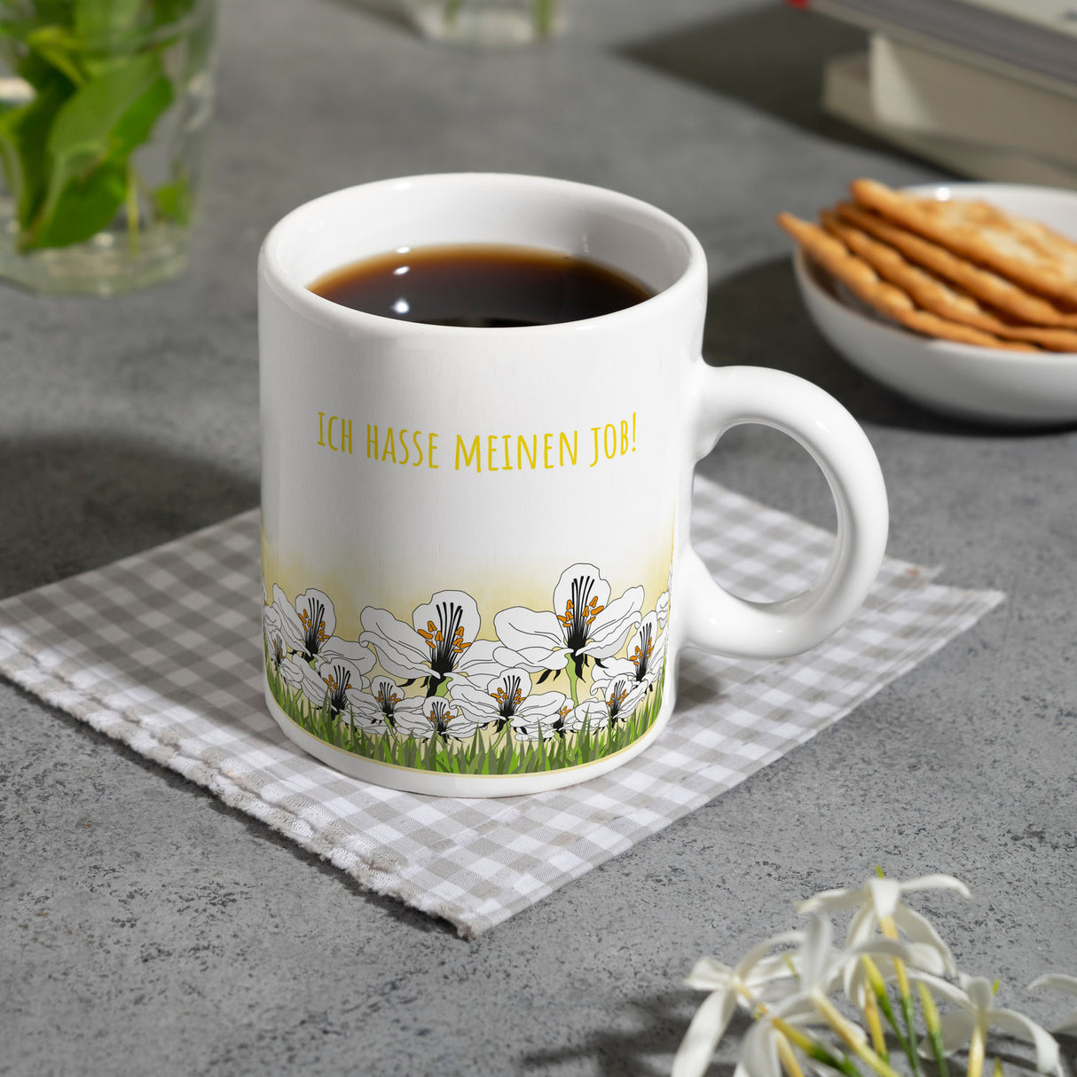 Kaffeebecher mit Wiesen-Motiv, Biene und witzigem Spruch fürs Büro oder Kollegen - Weiß ist auf Lager und wird versandt, sobald es wieder verfügbar ist