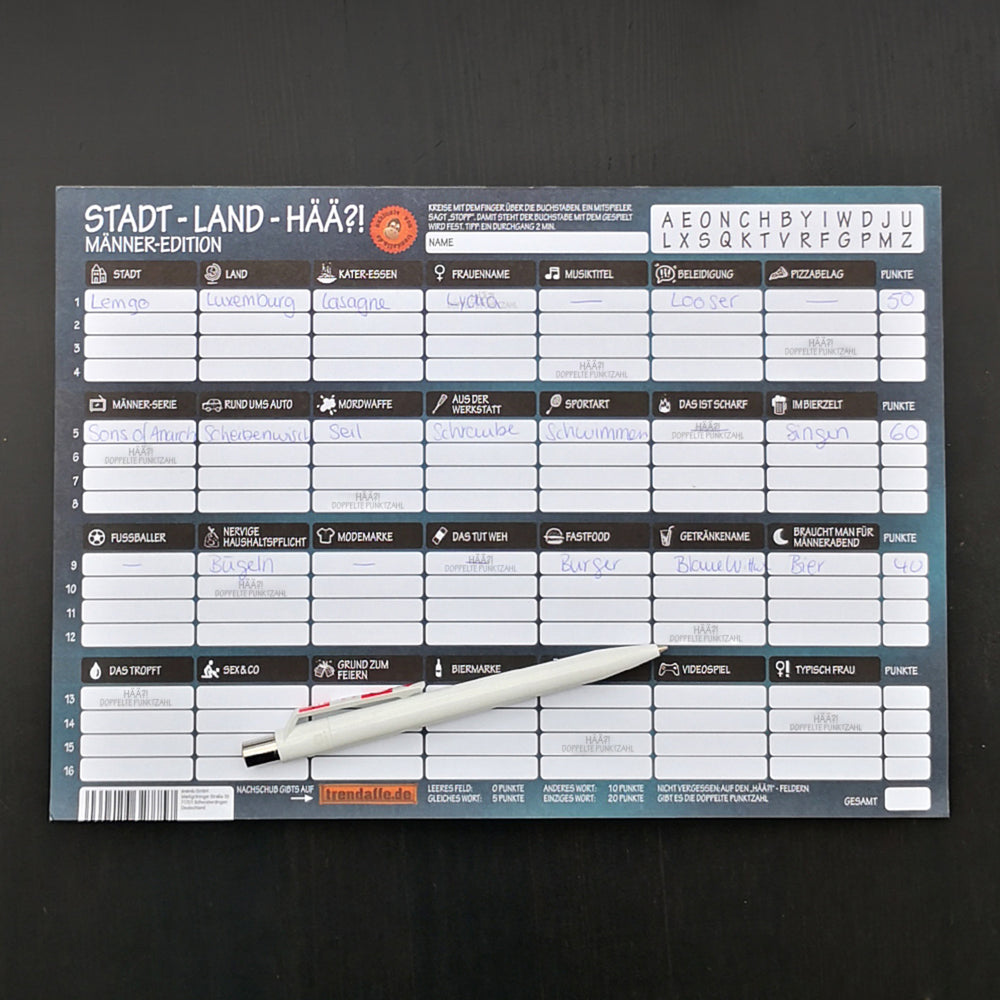 - Lieferumfang: 1x Stadt Land Hää?! Männer Edition Spielblock.