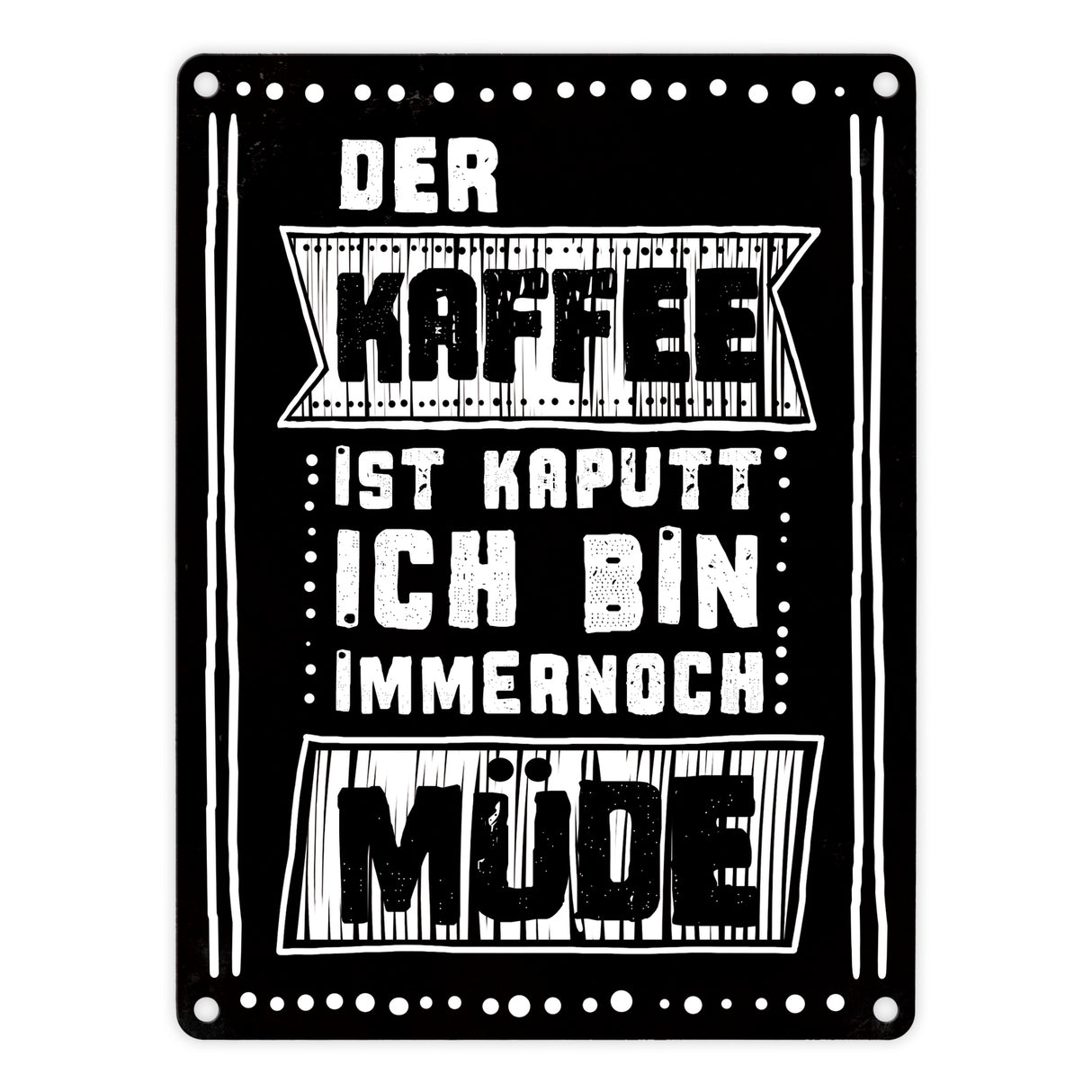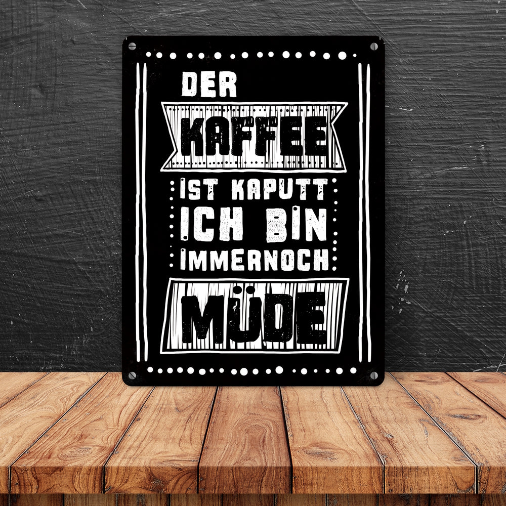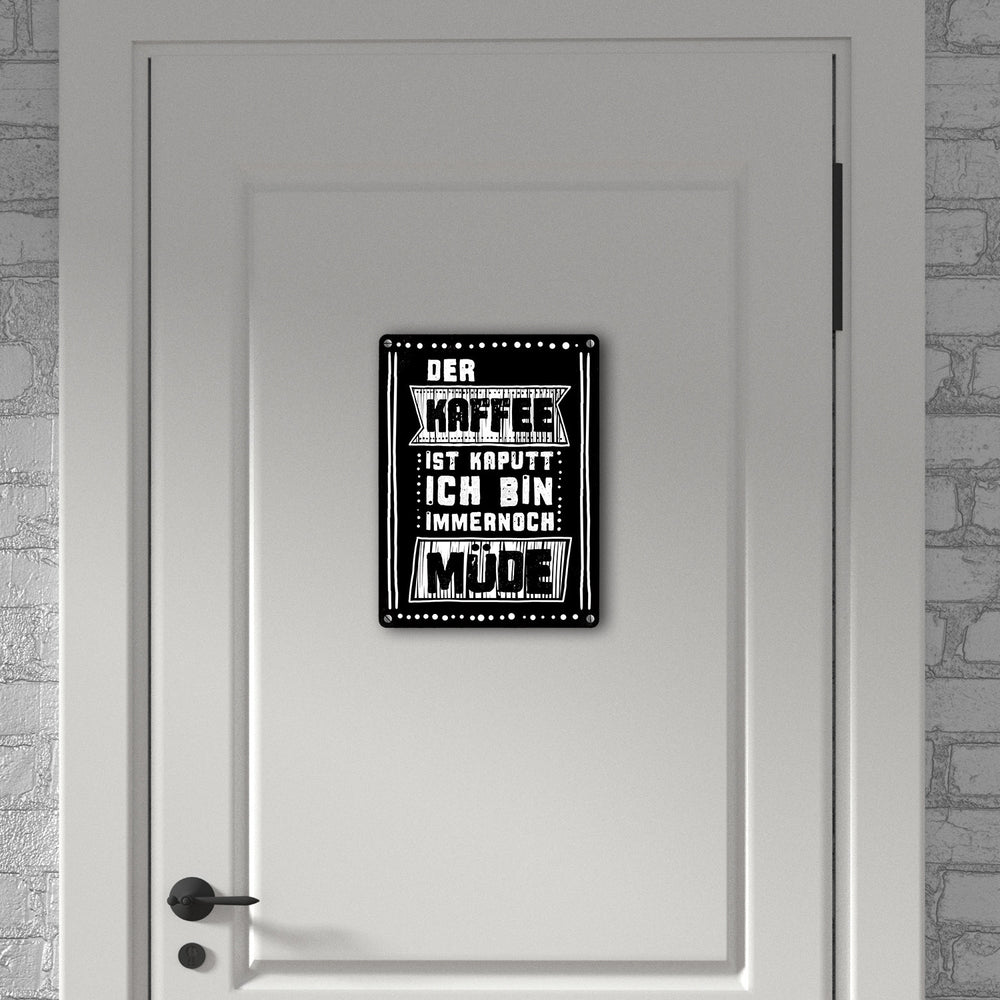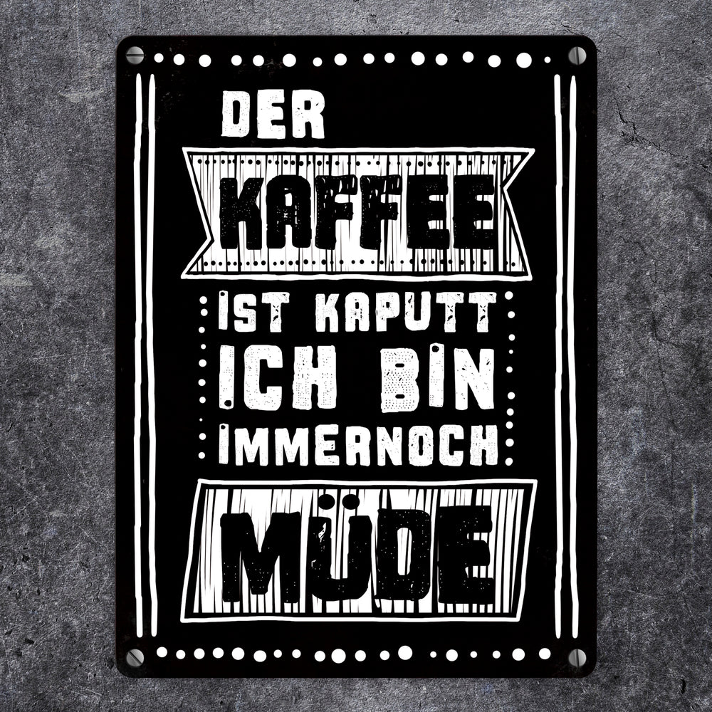 - 1x Morgen Metallschild mit Kaffee Spruch: Der Kaffee ist kaputt - ich bin immernoch müde in der gewählten Größe
