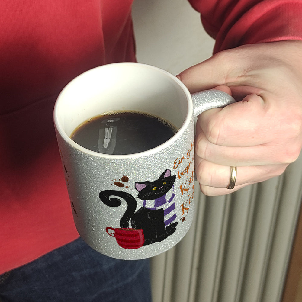 Unsere Kaffeebecher mit dem Aufdruck Ein guter Tag beginnt mit Katzen und Kaffee sind ein wunderschönes Geschenk für alle Katzenbesitzer und Kaffeeliebhaber. Sie bestehen aus hochwertigen Materialien und sind in verschiedenen Ausführungen erhältlich - als weiße Standardtasse, mit farbigem Henkel und Innenseite, als edle Glastasse oder in der exklusiven Silberedition mit Glitzereffekt. Mit unverwechselbarem Design und Sorgfalt in Handarbeit hergestellt in Deutschland machen sie Freude auf die bunte Herbst- und Winterzeit. Egal ob als kleines Geschenk zu Weihnachten, Geburtstag oder einem anderen Anlass - unsere schicken Tassen sind eine Aufmerksamkeit für Familie, Bekannte, Verwandte oder Kollegen. Unser qualitativ hochwertiger Druck ist eine Freude für alle Sinne! Schenken Sie Ihren liebsten Menschen einen guten Start in den Tag!