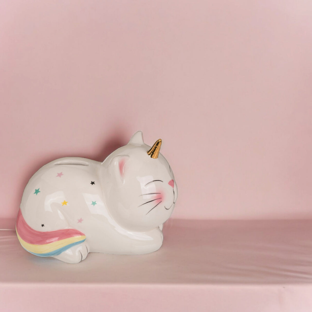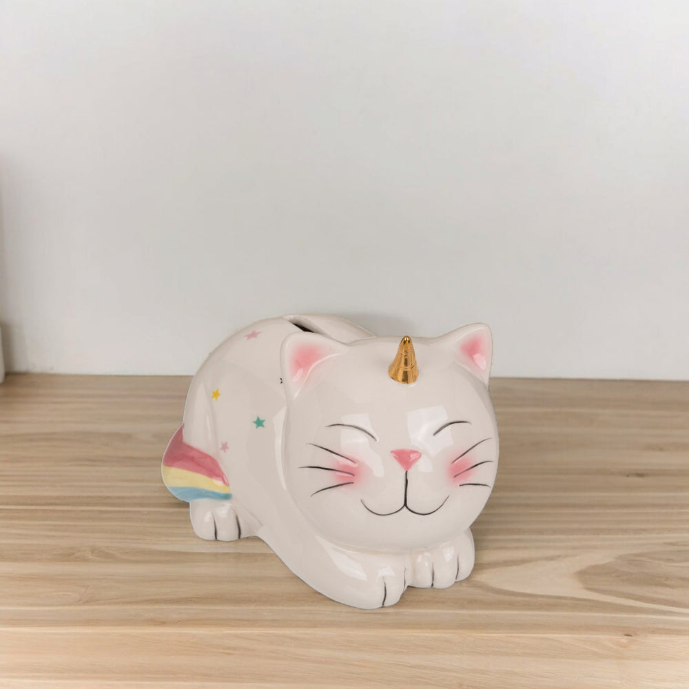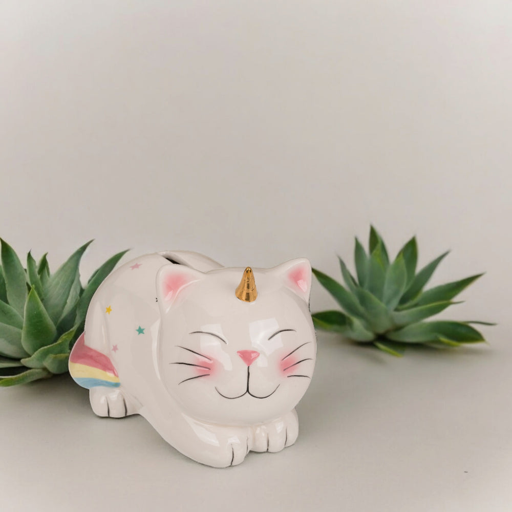 - Wo Katze auf Einhorn trifft, ist Spaß garantiert: Mit gold-glänzendem Horn und Sternen, die funkeln, wird das Sparschwein zum Hingucker. Der regenbogenbunte Schwanz wedelt vor Freude, während Münzen durch den Slot im Keramik-Schloss verschwinden. Sicher bewacht, bis der Schlüssel das Schatzkästchen öffnet.