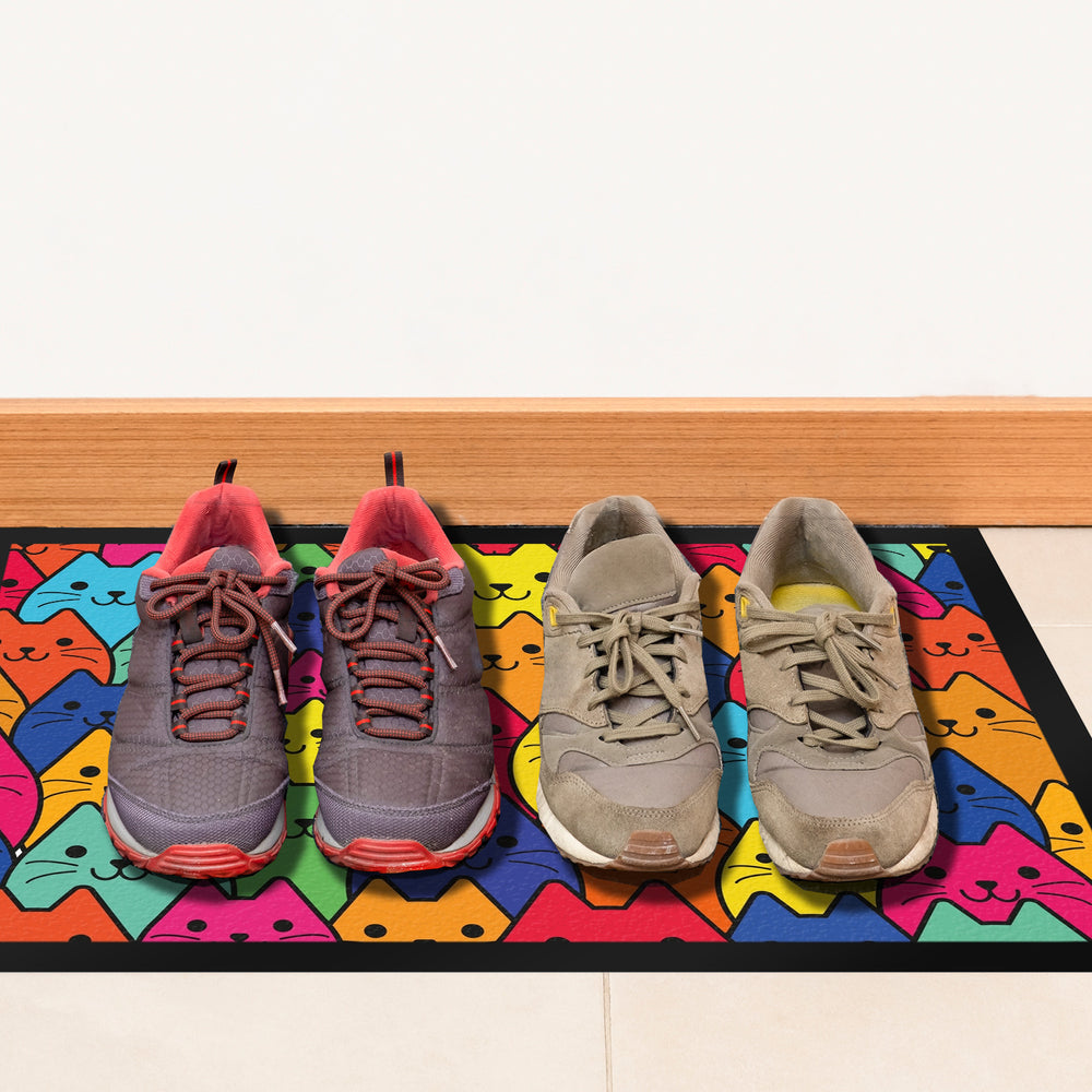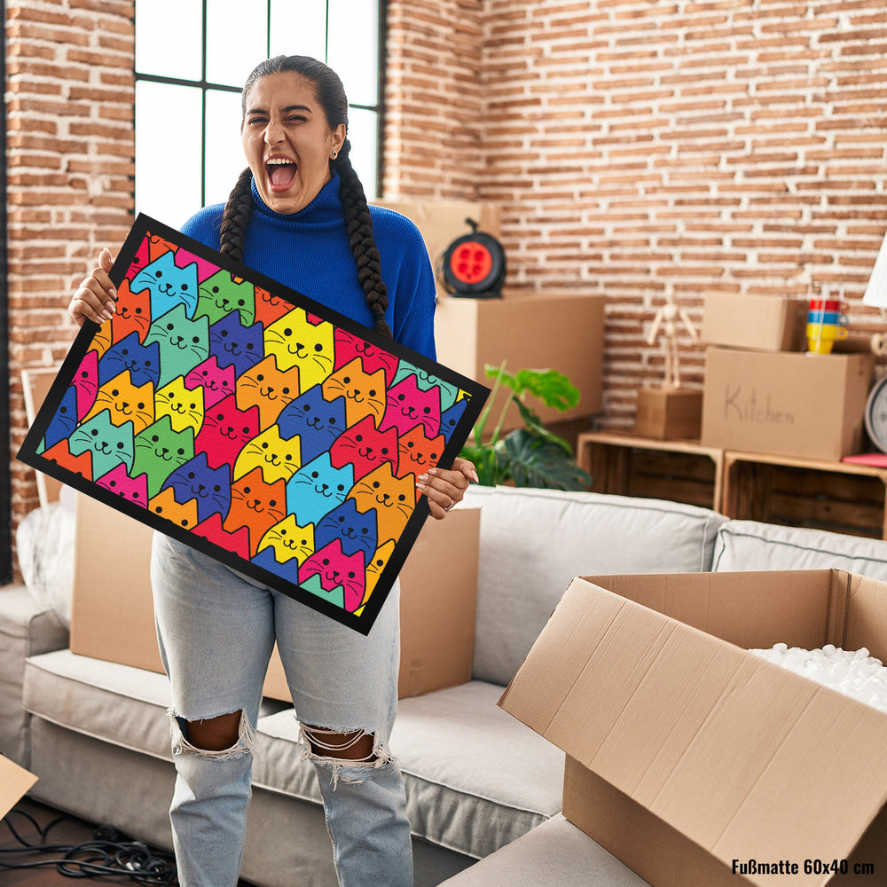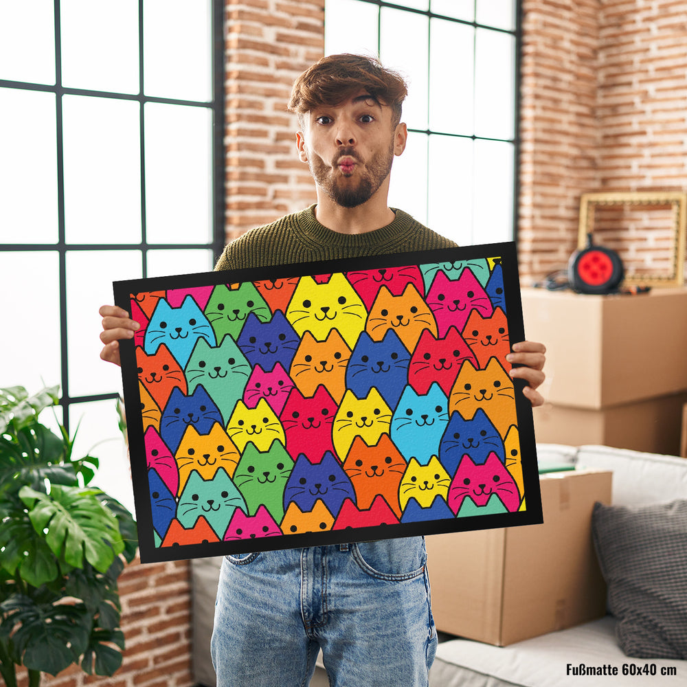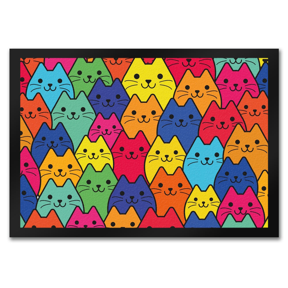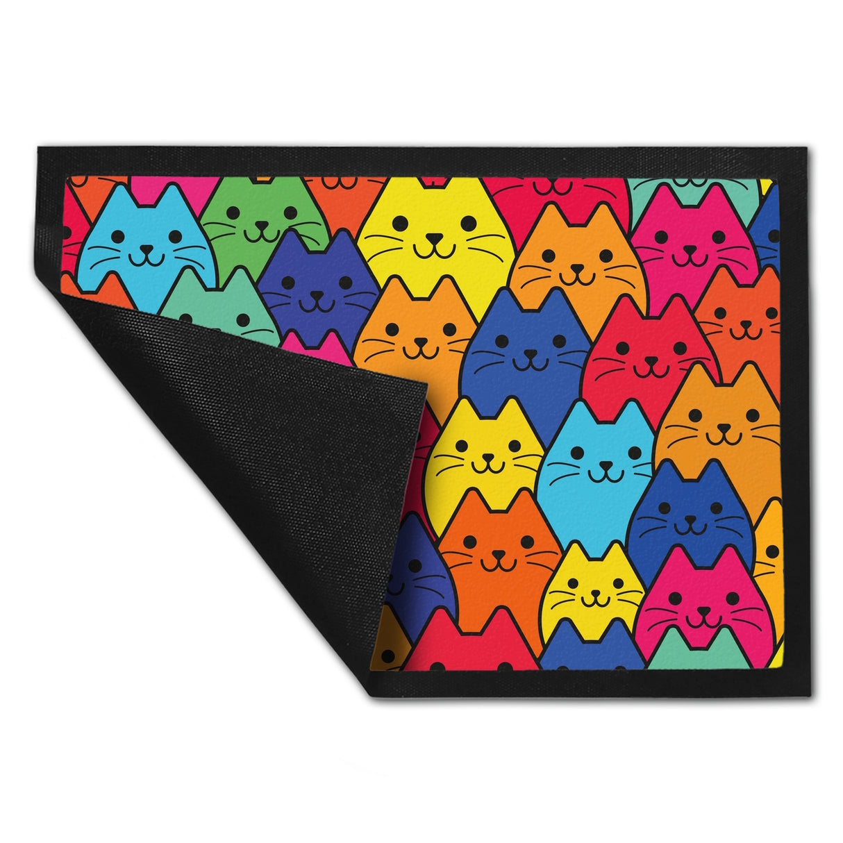 • Wer es gerne etwas verrückt mag und Katzen liebt, der braucht wahrscheinlich diese farbenfrohe Wimmelbild-Fußmatte mit unzähligen bunten Katzen, welche dich herzlich begrüßen, wenn du nach Hause kommst.