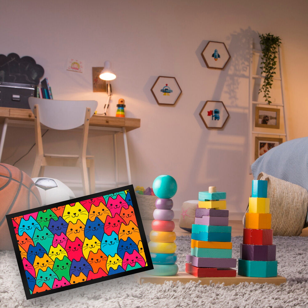 Diese Fußmatte mit Katzen Motiv ist ein witziges und farbenfrohes Geschenk für alle, die Katzen lieben. Mit dem bunten Wimmelbild-Design wird sie jeden Eingang verschönern. Sie ist aus pflegeleichter Kunstfaser und verfügt über eine rutschfeste Gummiunterseite sowie niedrigen Gummirand. Dank der satten Regenbogenfarben und der modernen Gestaltung passt sie in jedes Zuhause. Sie ist robust und Wasserundurchlässig und kann im Innen- und Außenbereich verwendet werden. Ob als Geburtstagsgeschenk oder Umzugsfeier, diese Fußmatte ist ein Highlight unter allen Geschenken!