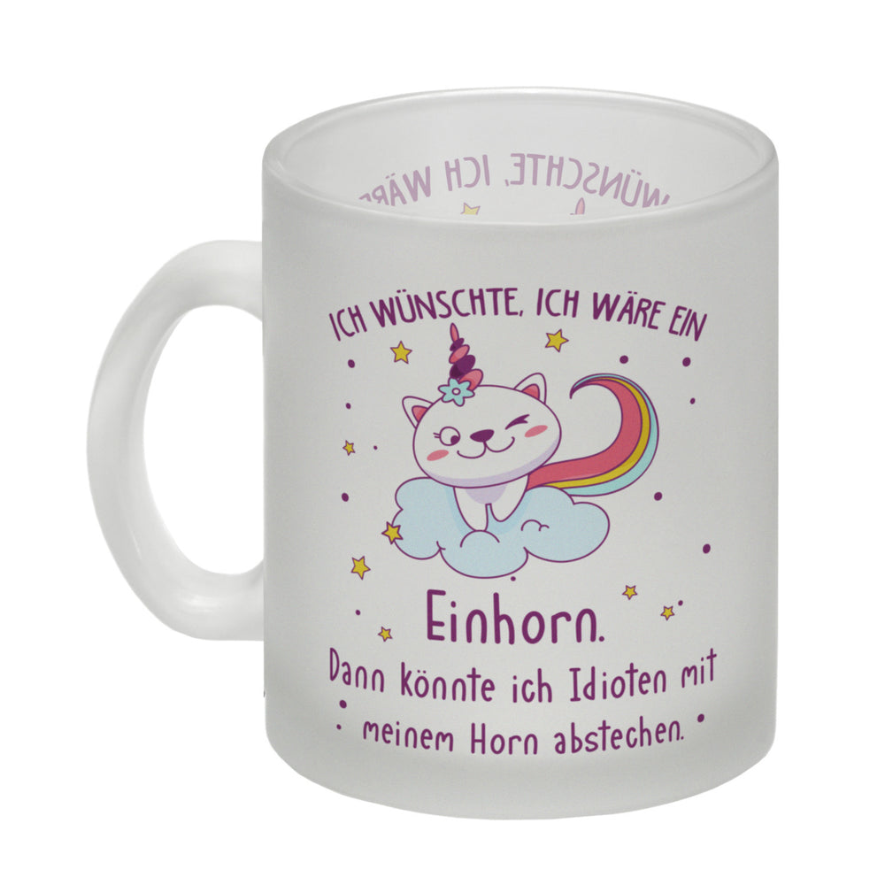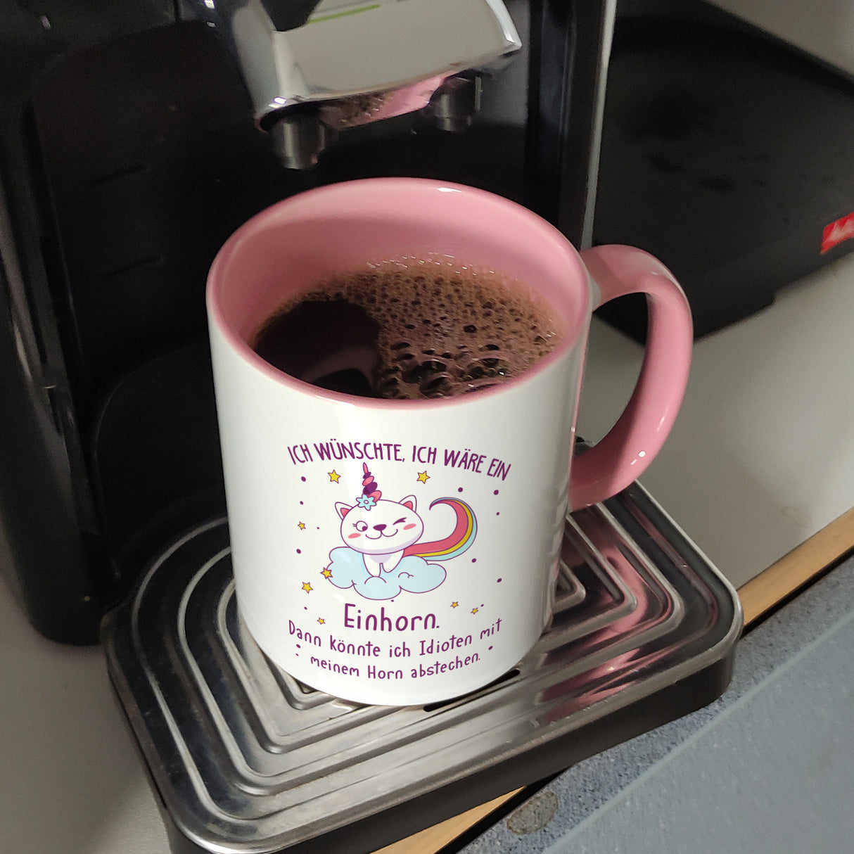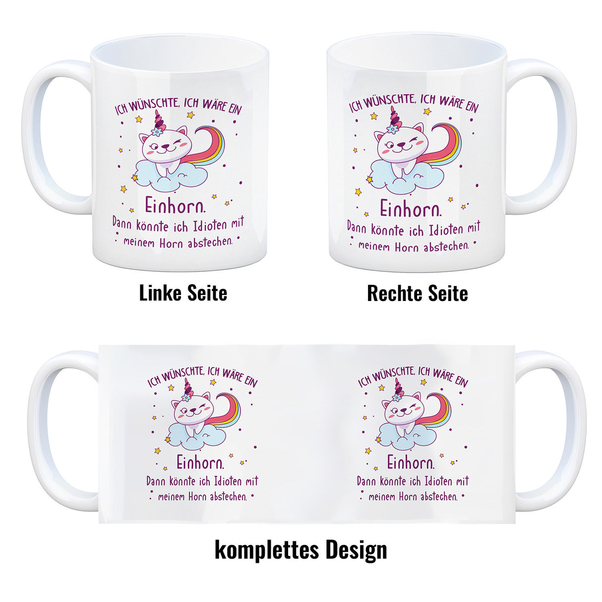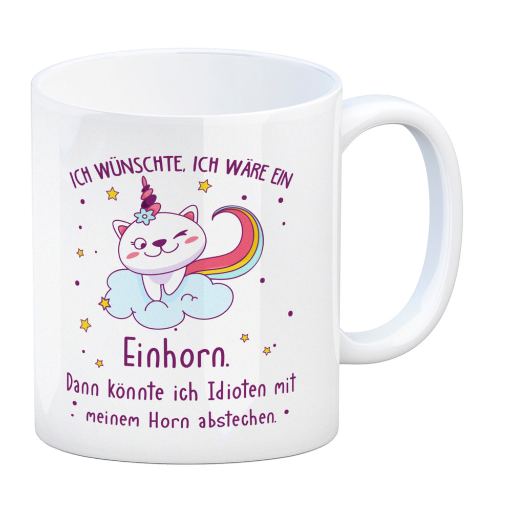 - Der Kaffeebecher mit Katzen-Einhorn-Motiv ist eine tolle Geschenkidee für Frauen zum Geburtstag. Der Becher zeigt ein süßes Einhorn und erinnert an Magie, Verträumtheit und Unbeschwertheit. Auf dem Artikel steht der Spruch: Ich wünschte ich wäre ein Einhorn. Mit dieser witzigen Kaffeetasse kann man seinen Liebsten jeden Tag Freude bereiten.
