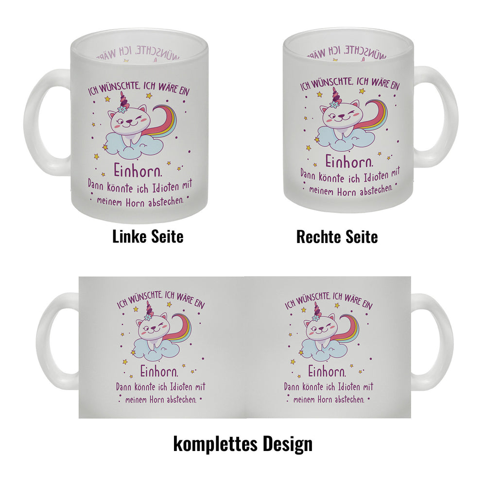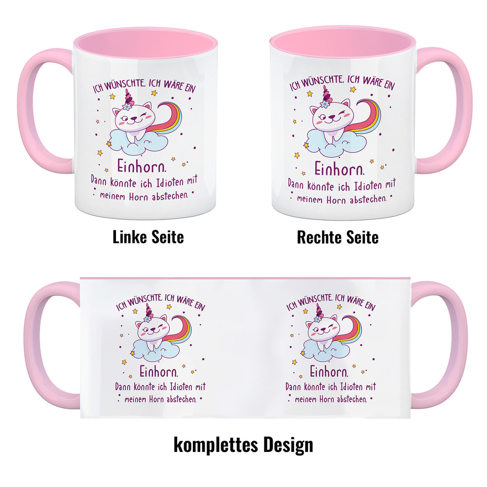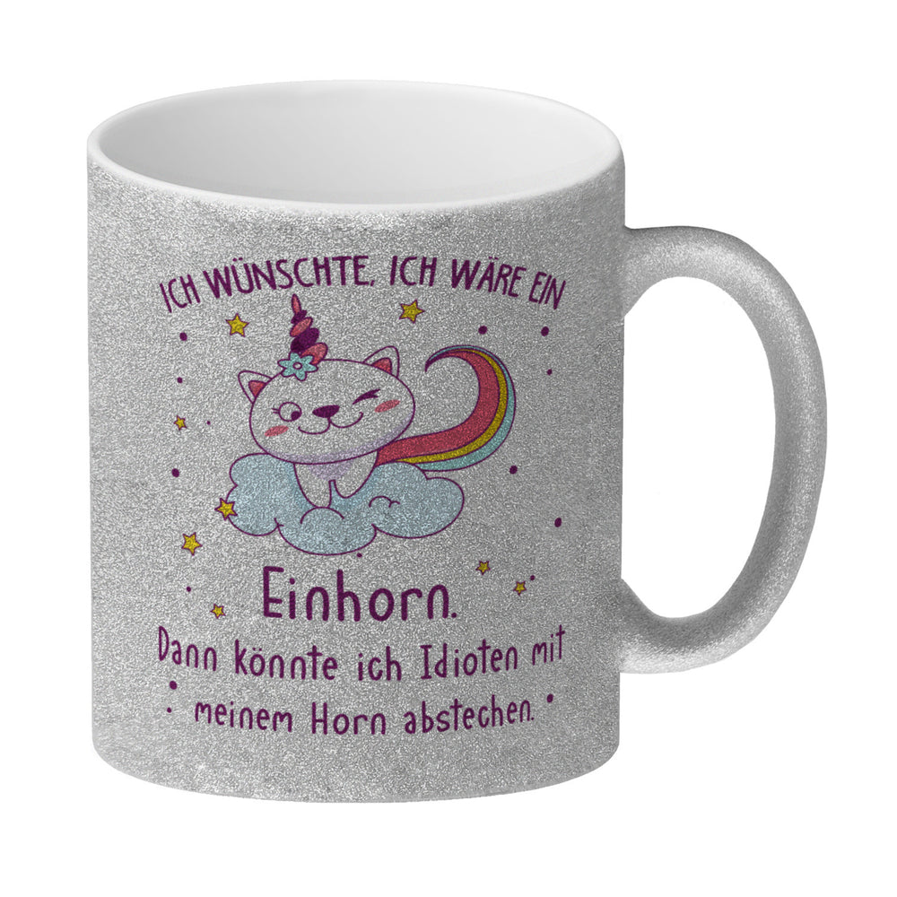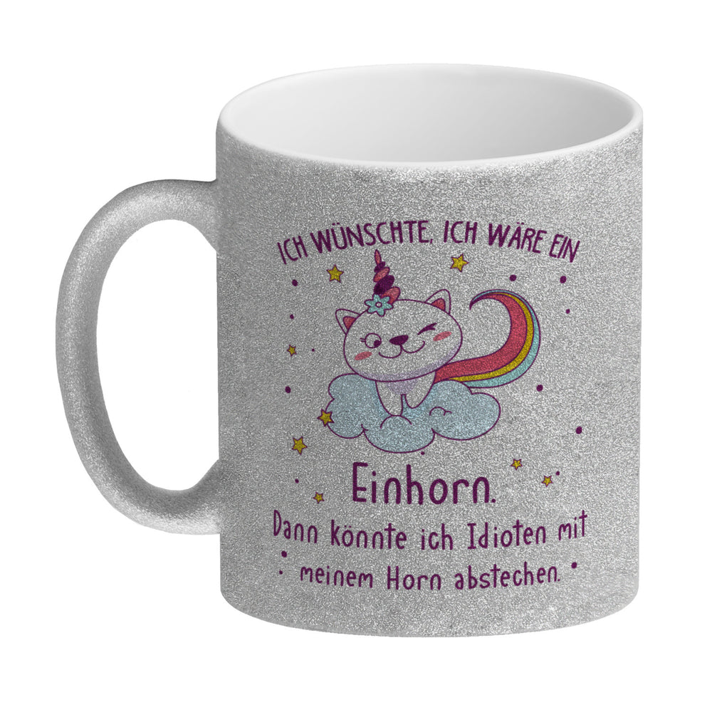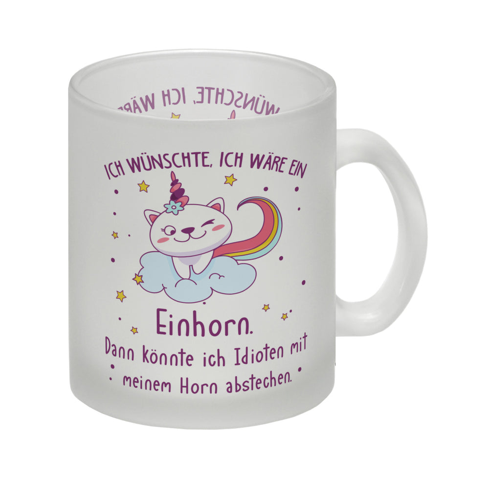 - Der Kaffeebecher mit Katzen-Einhorn-Motiv ist eine tolle Geschenkidee für Frauen zum Geburtstag. Der Becher zeigt ein süßes Einhorn und erinnert an Magie, Verträumtheit und Unbeschwertheit. Auf dem Artikel steht der Spruch: Ich wünschte ich wäre ein Einhorn. Mit dieser witzigen Kaffeetasse kann man seinen Liebsten jeden Tag Freude bereiten.
