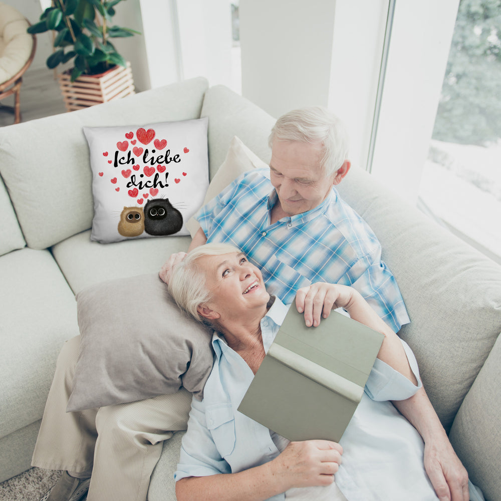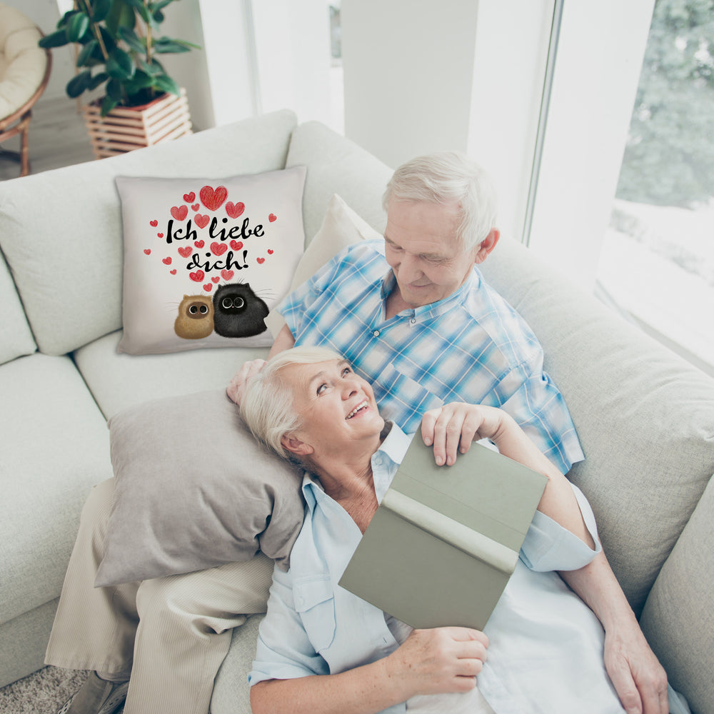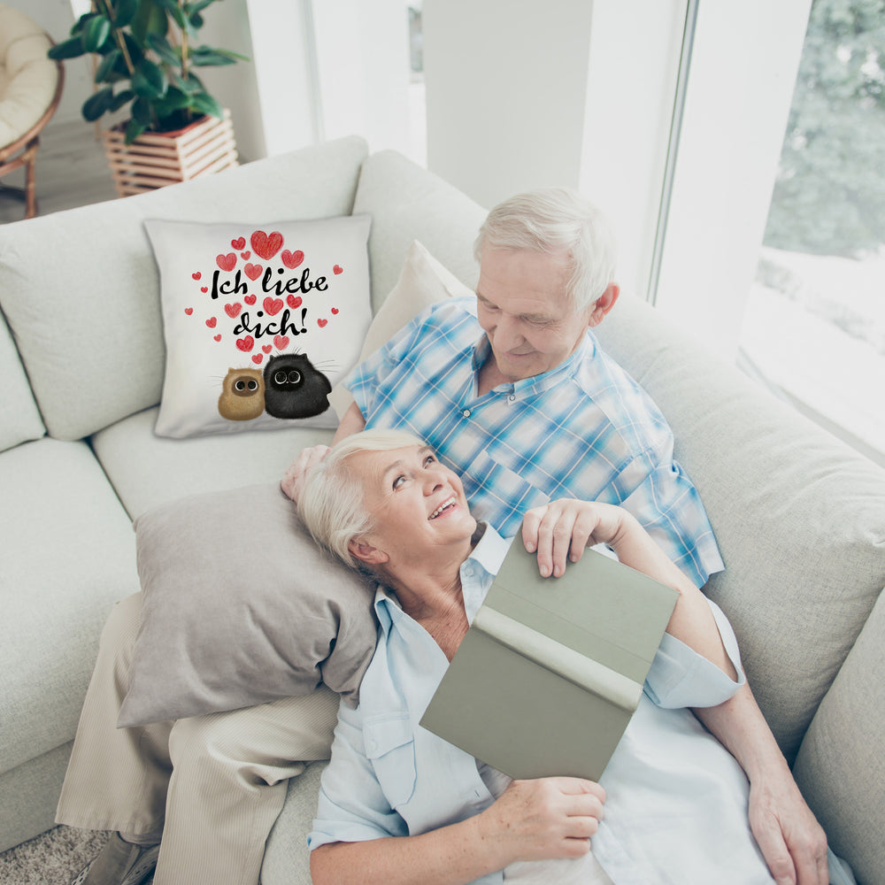 • Schmeißt euch in die Kissen-Festung der Liebe mit unserem "Katzen Kissen mit Spruch"! Zwei schnurrende Turteltauben zeigen euch, wie man Romantik pur erlebt – flauschig, gemütlich und mit einer klaren Botschaft: "Ich liebe dich!". Perfekt, um eurem Schmusepartner am Valentinstag zu schnurren: Du bist mein Lieblingsmensch!