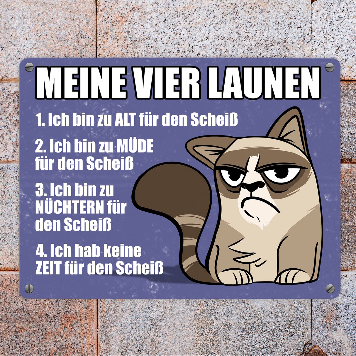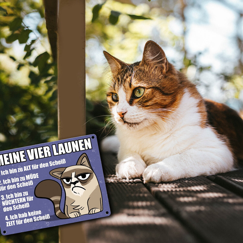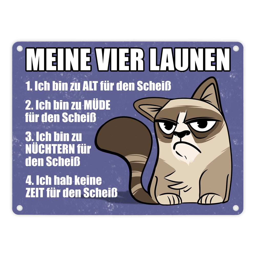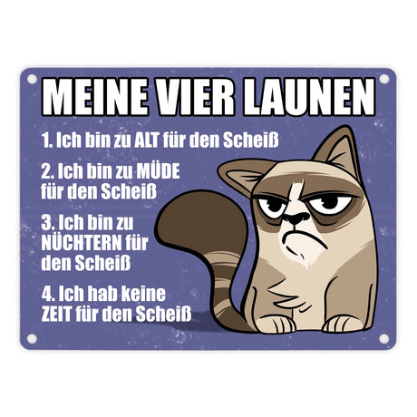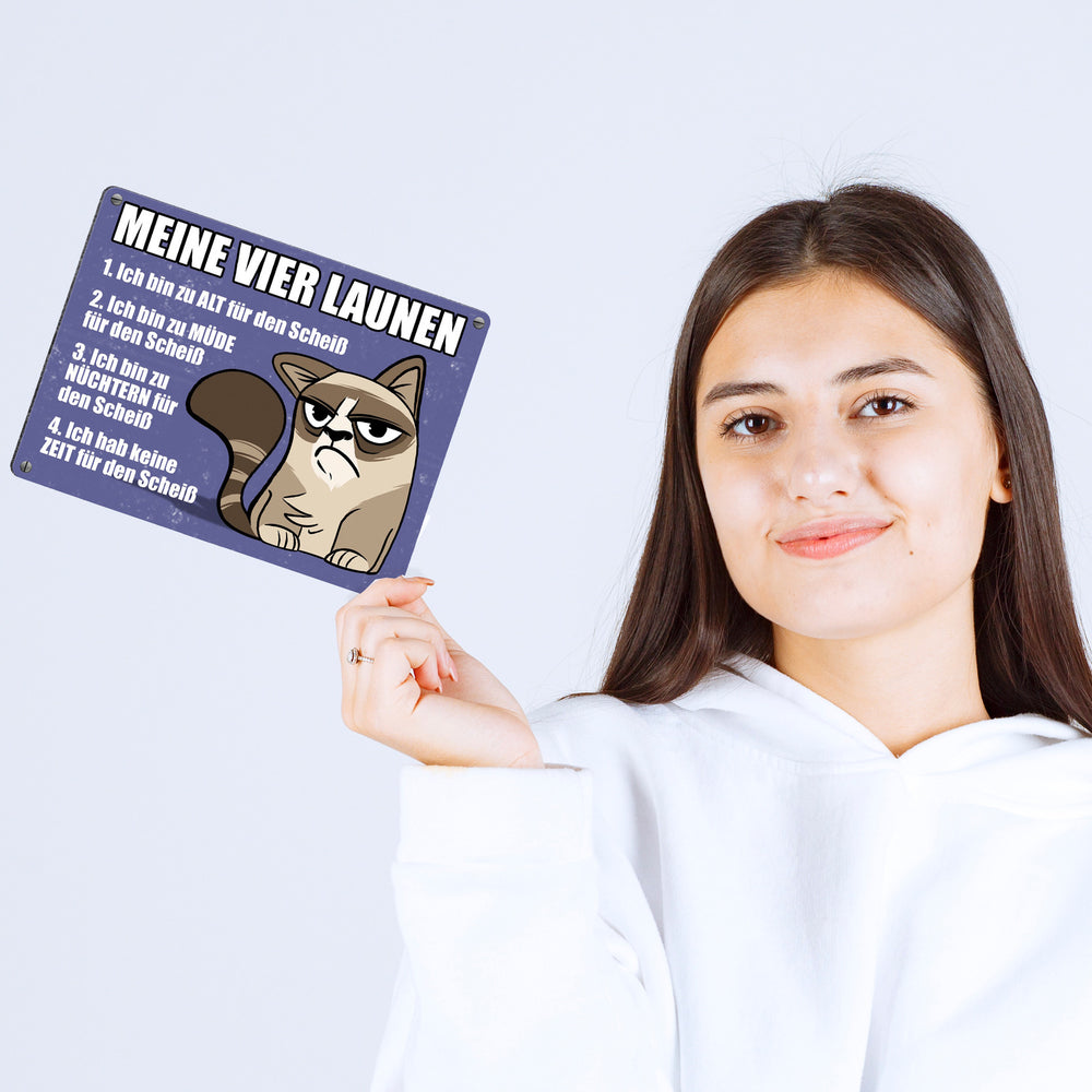 Meine vier Launen Metallschild mit der lustigen grummeligen Katze