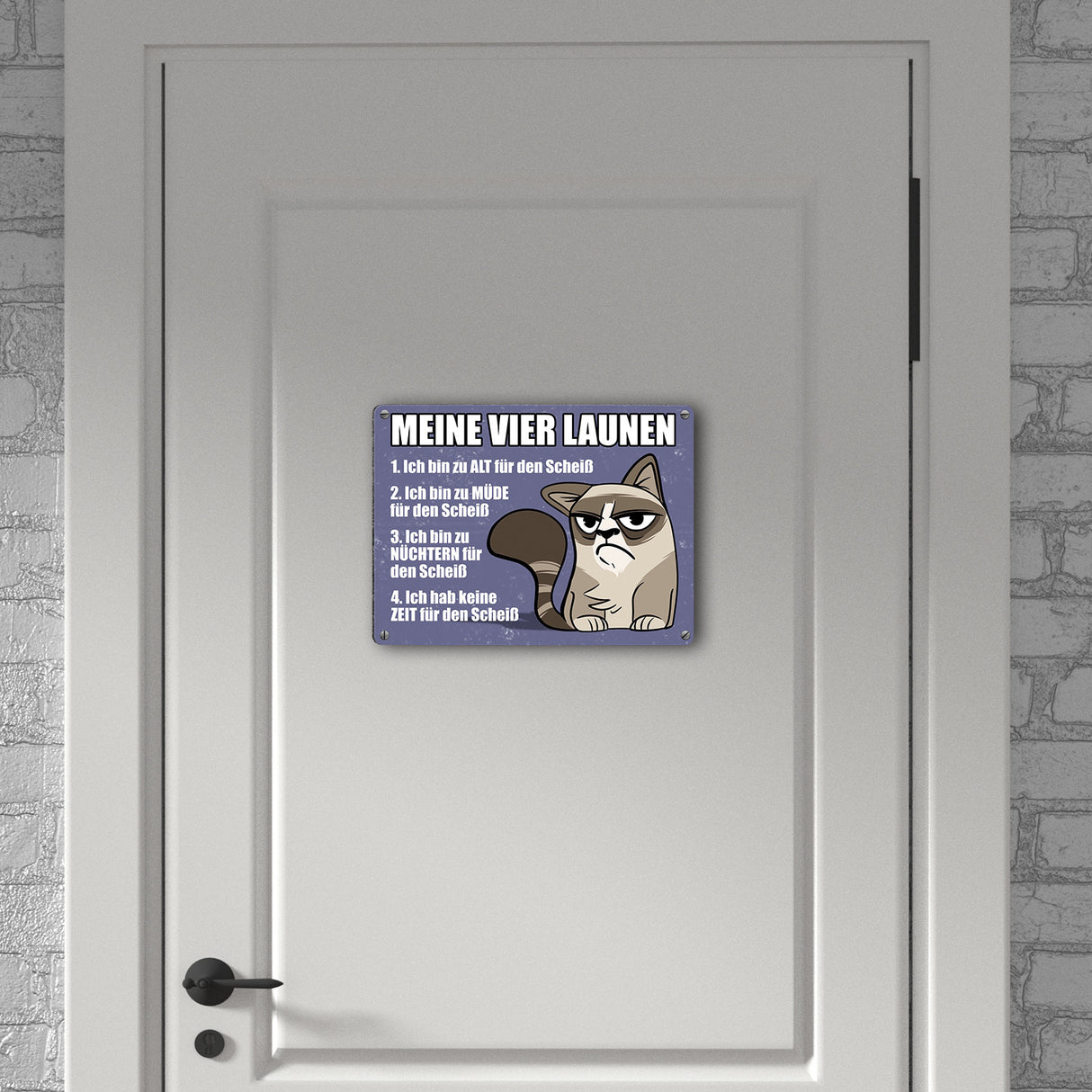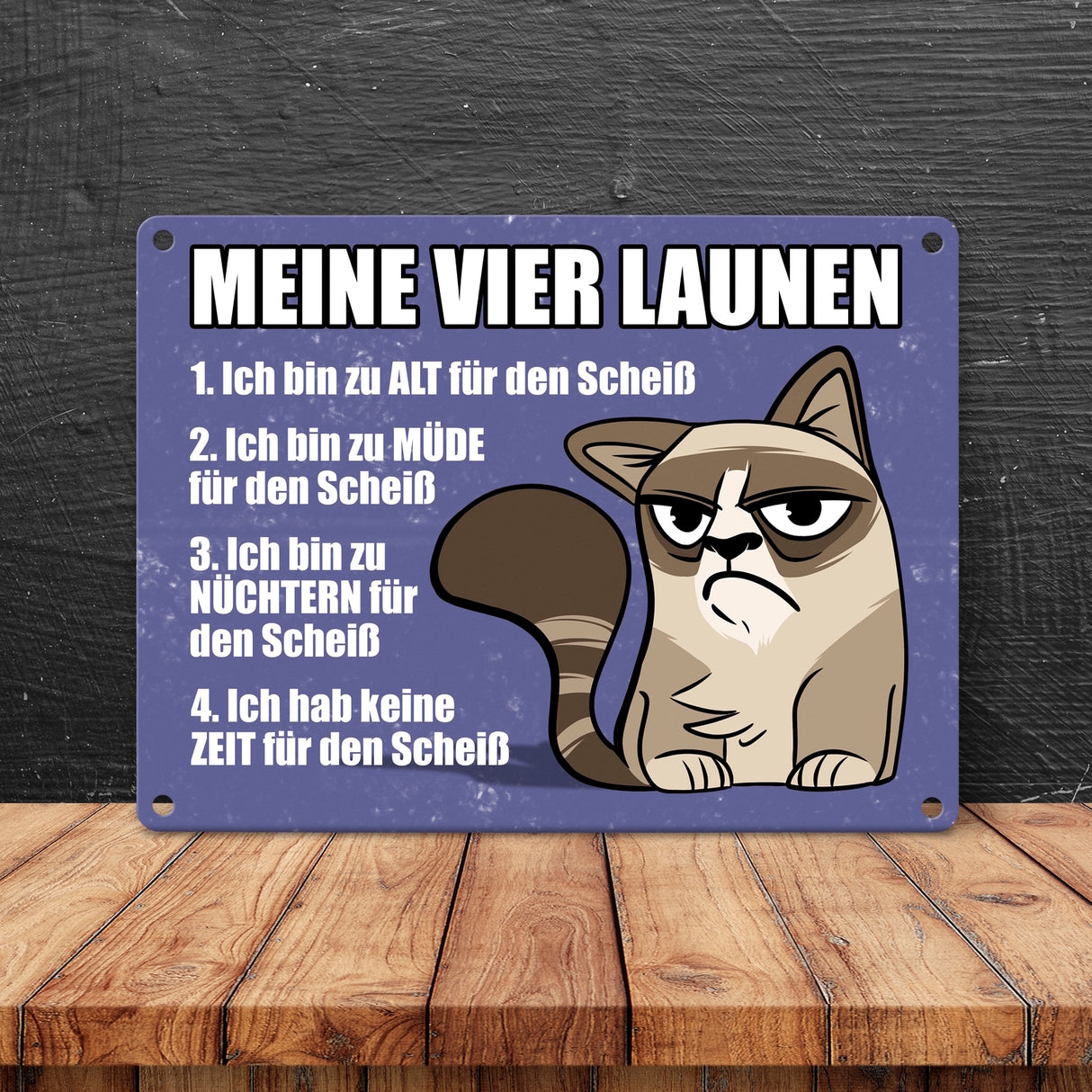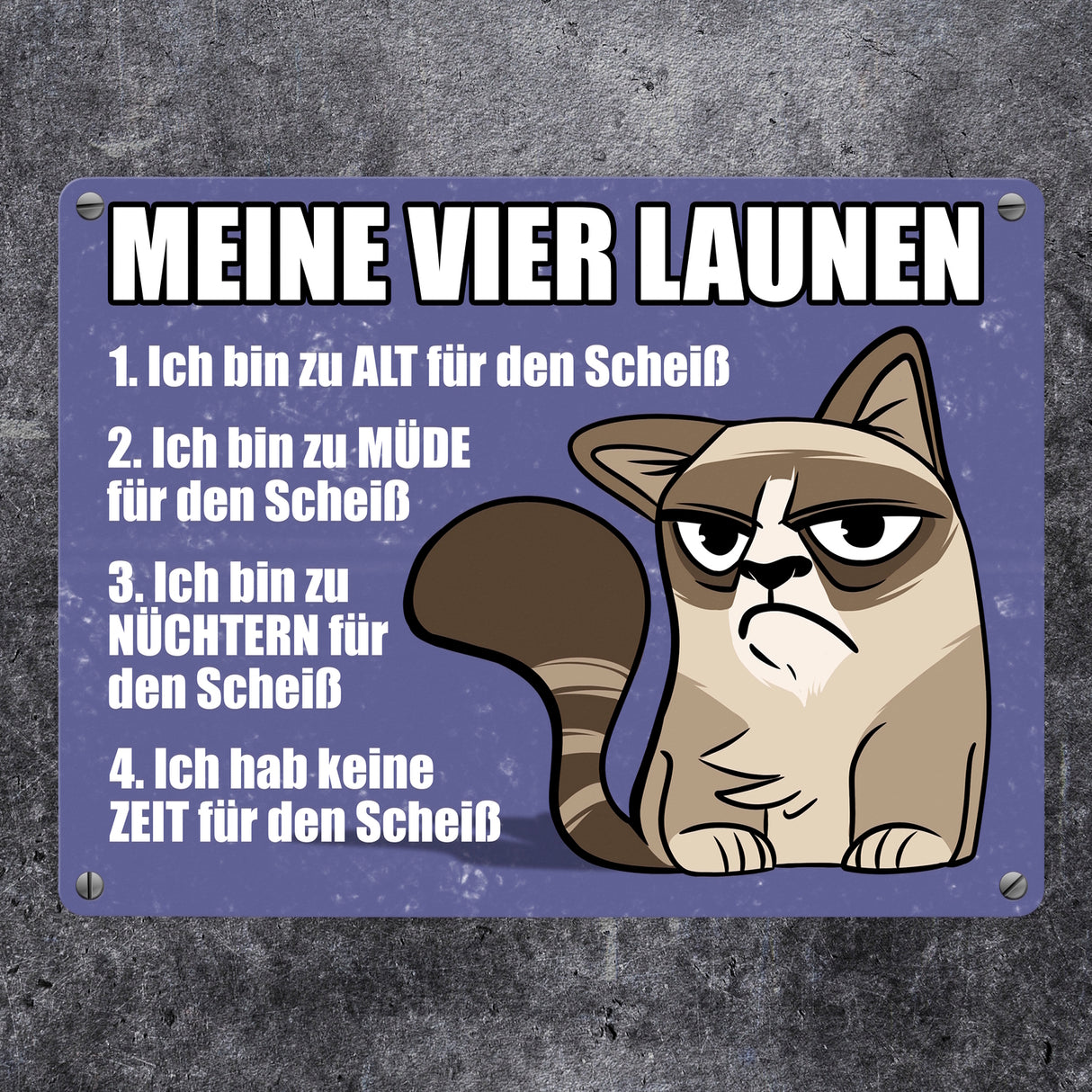 Meine vier Launen Metallschild mit der lustigen grummeligen Katze