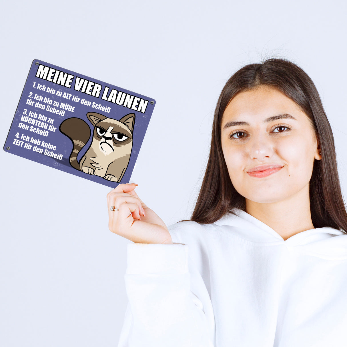 - 1x Meine vier Launen Metallschild mit der lustigen grummeligen Katze in der gewählten Größe