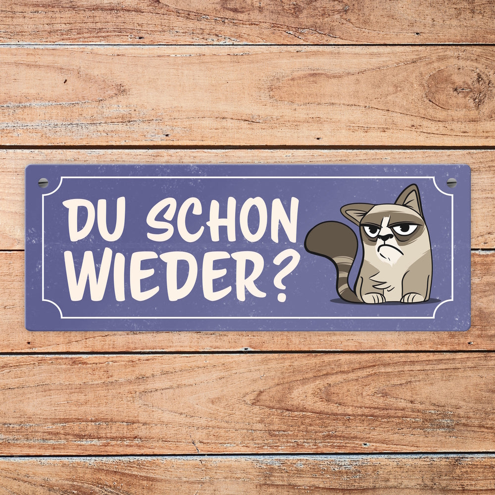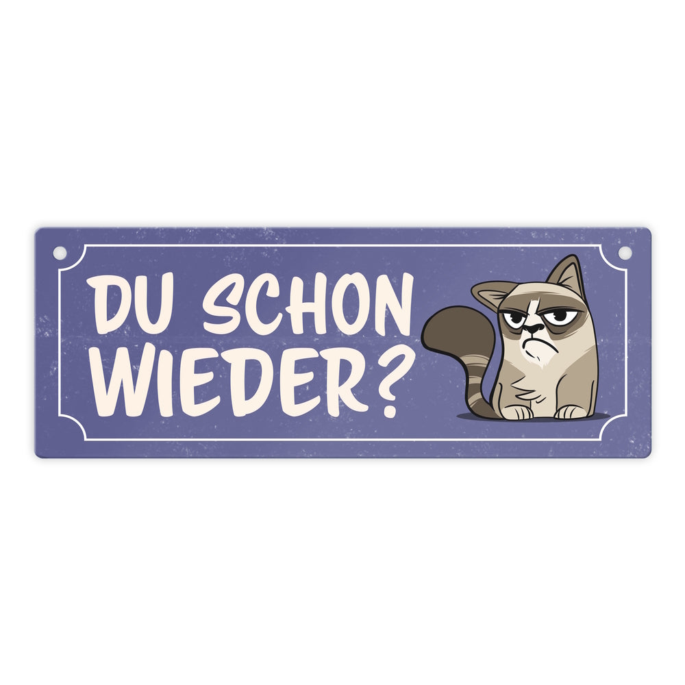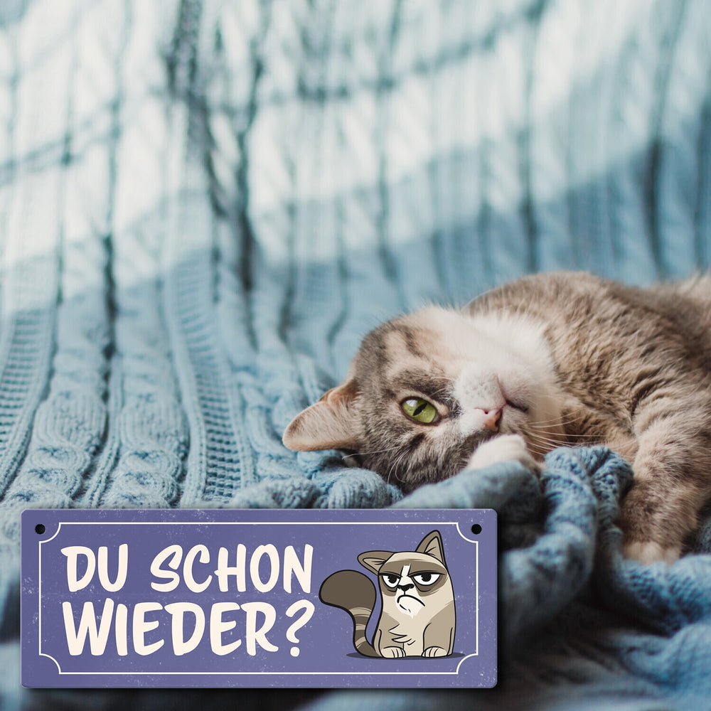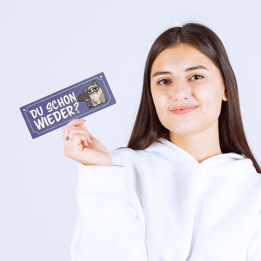 - 1x Metallschild mit Spruch und genervter Comic Katze - Du schon wieder? in der gewählten Größe