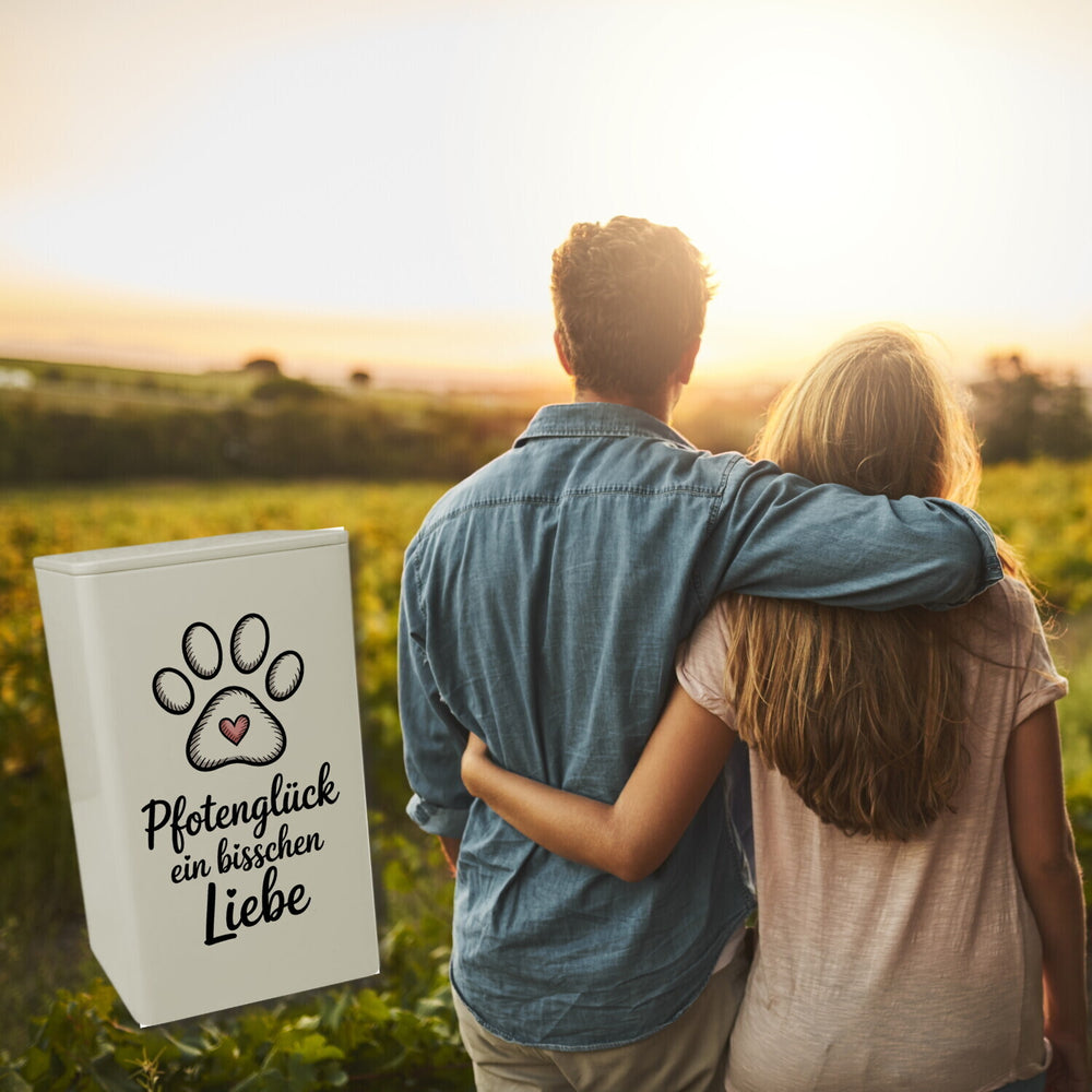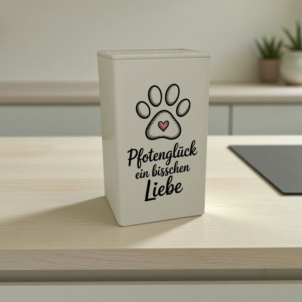 - Diese lustige Metalldose punktet mit einem minimalistischen Design. Auf dem weißen Hintergrund prangt ein skizzenhafter Pfotenabdruck mit einem Herzen in weichen Strichen. Der Schriftzug "Pfotenglück Ein bisschen Liebe" verleiht der Dose eine persönliche Note. Einfach unwiderstehlich charmant für Tierfreunde!