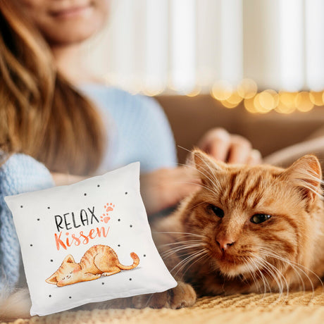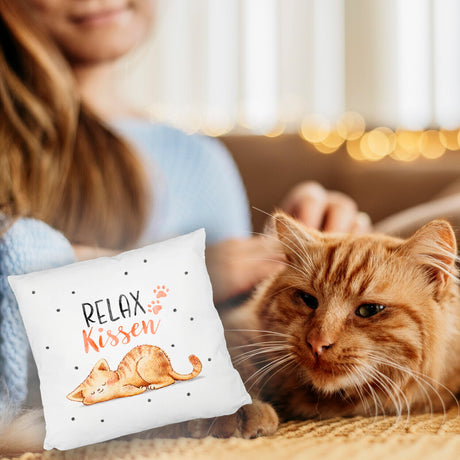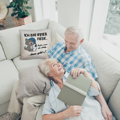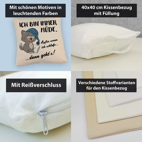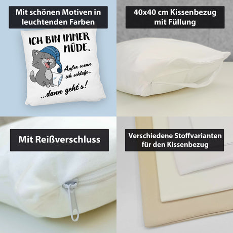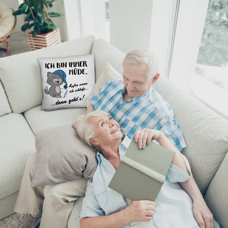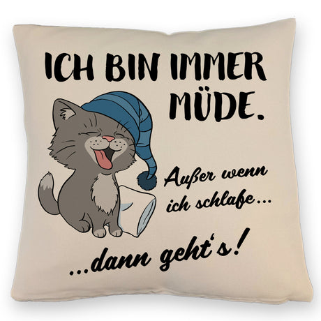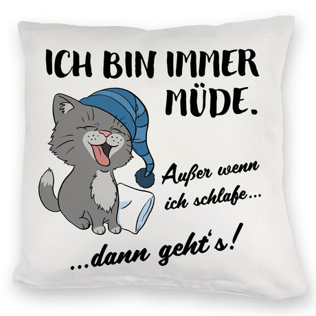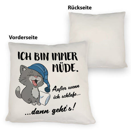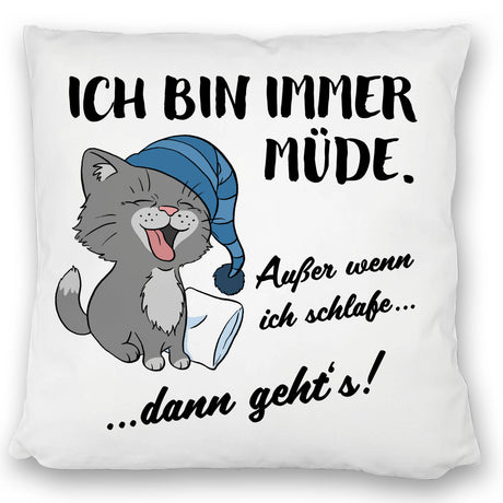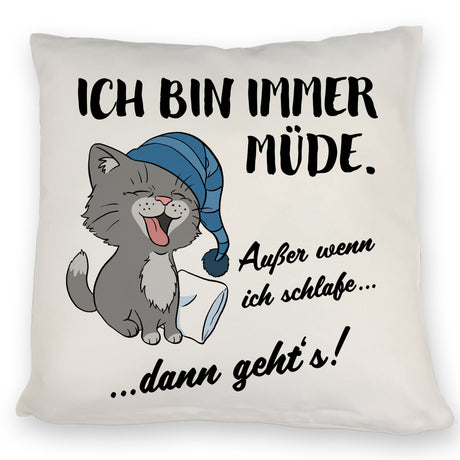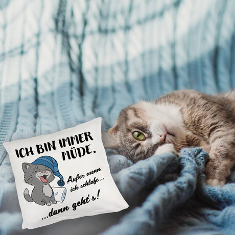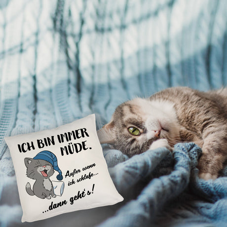 Katze Kissen mit Spruch- Immer müde außer wenn ich schlafe