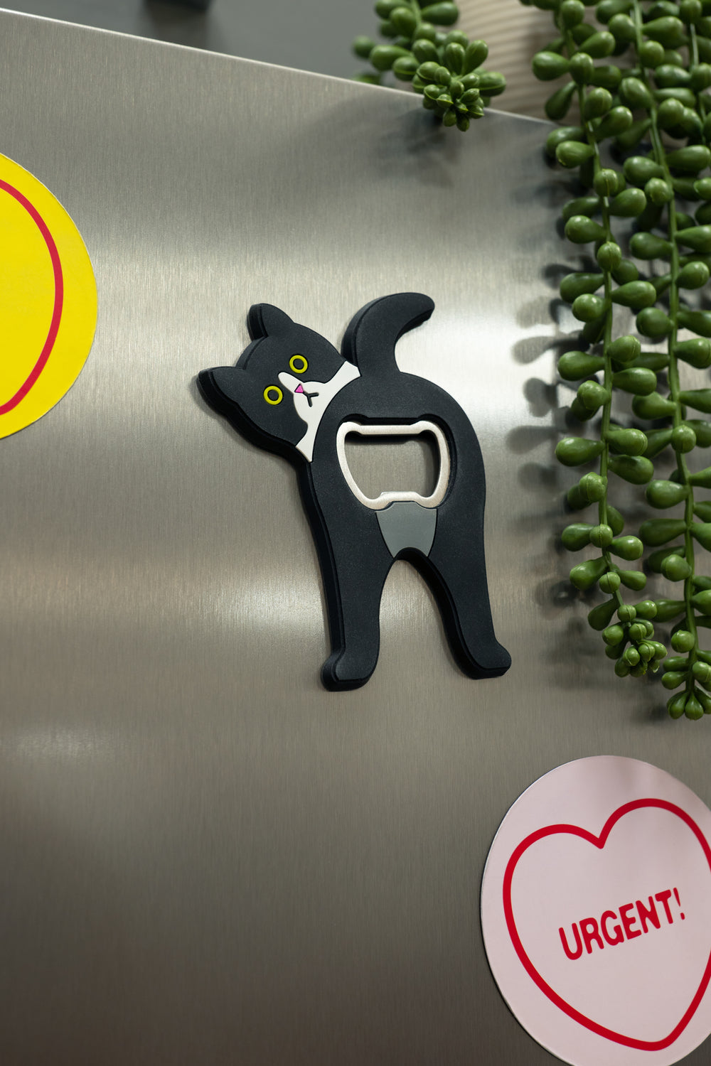 - Der Flaschenöffner ist in Form einer Katze gestaltet, die frech ihren Hintern präsentiert. Das schlichte schwarze Design ist nicht nur schick, sondern auch praktisch – dank Magnet hält er sicher an Kühlschränken oder anderen Metalloberflächen. Ein Kätzchen, das Ihre Flaschen öffnet und Ihre Küche dekoriert!
