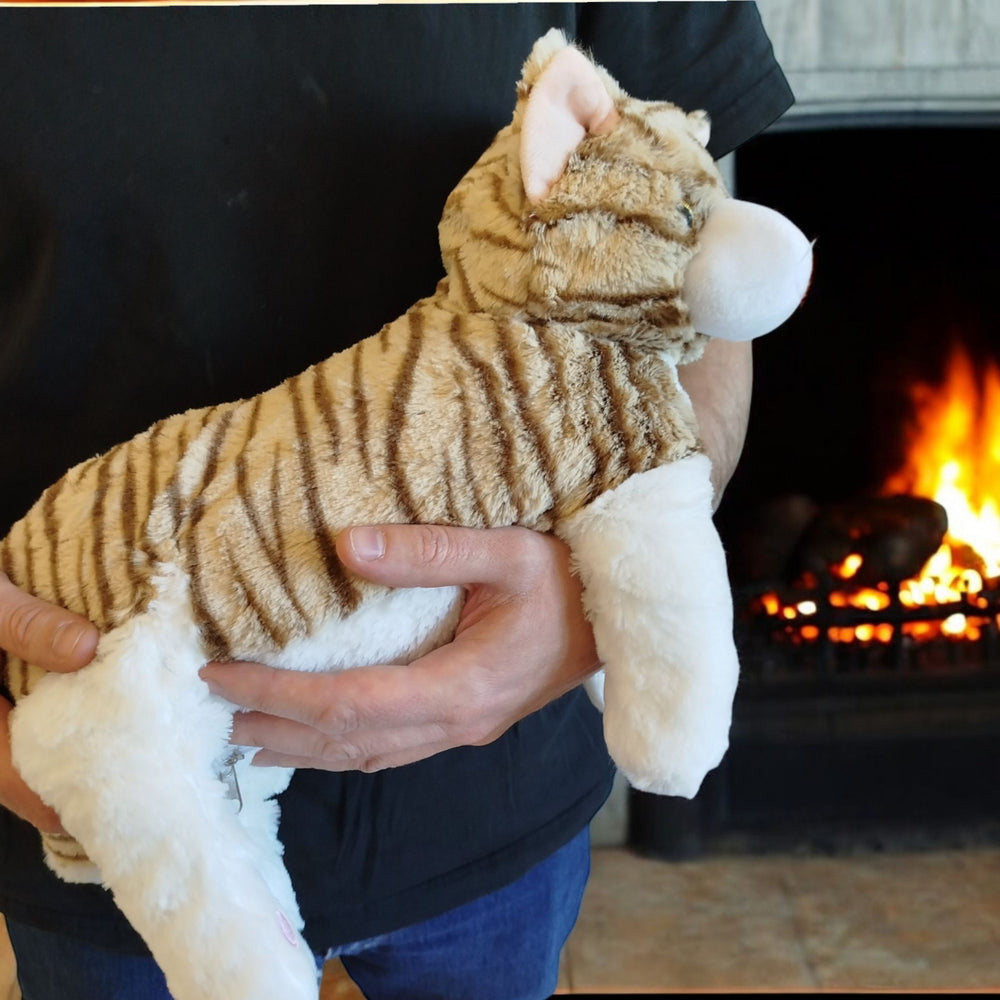 - Das Design ist einfach zuckersüß! Die Katzen-Mama liegt gemütlich auf dem Bauch, mit weichem, hellbraun-getigertem und weißem Fell. Ihre Knopfaugen sind einfach unwiderstehlich! Öffne den Reißverschluss am Bauch und entdecke die drei goldigen Katzenbabys. Diese kleinen Kater in verschiedenen Grautönen sind genauso kuschelig und perfekt für Abenteuer!