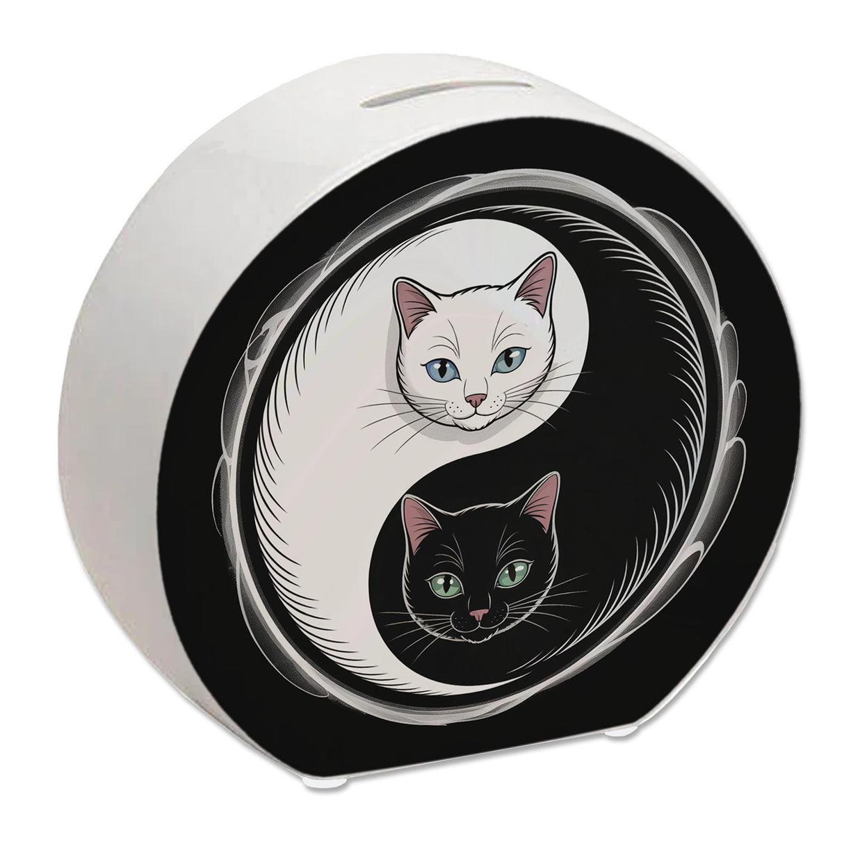 - Diese einzigartige Spardose zeigt das faszinierende Yin und Yang Motiv mit zwei Katzen. Eine weiße Katze mit leuchtend blauen Augen und sanftem Ausdruck und eine schwarze Katze mit durchdringend grünen Augen und verspielter Haltung bilden das Kreis-Symbol. Umrahmt von einem schwarzen Hintergrund wirken sie mystisch und harmonisch.