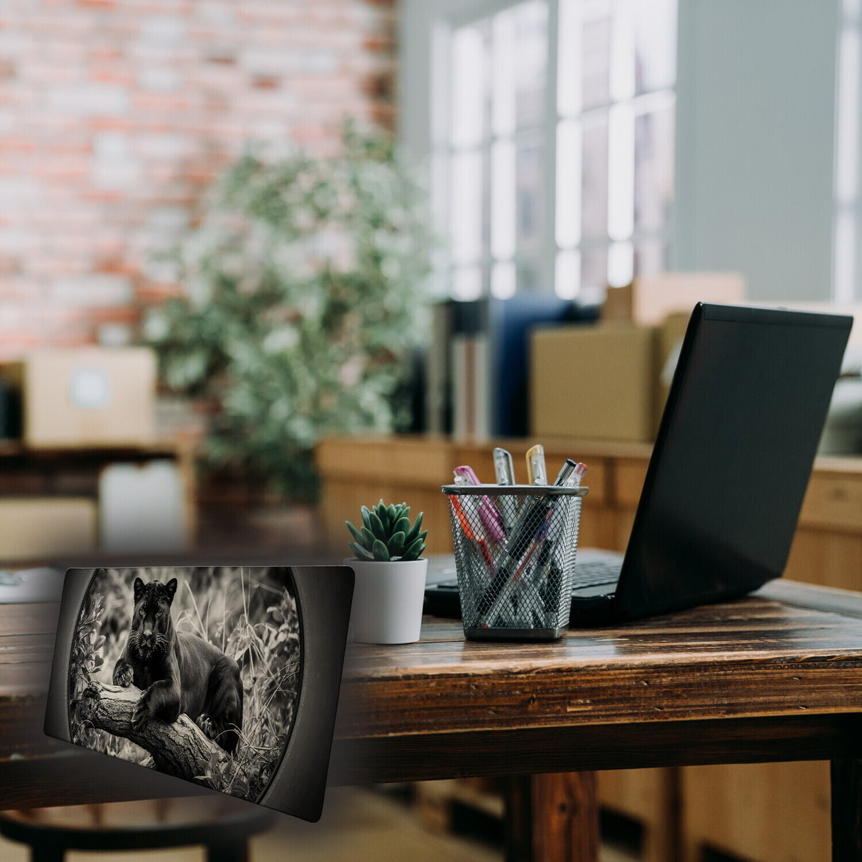 - Diese Schreibtischunterlage zeigt einen majestätischen schwarzen Panther, der anmutig auf einem Baumast thront. In einem kunstvollen Schwarz-Weiß-Design hervorgehoben, sind die Details des Panthers atemberaubend. Die wachsamen Augen und der muskulöse Körper fesseln den Blick, während der weiche, verschwommene Hintergrund eine mystische Dschungel-Atmosphäre schafft.