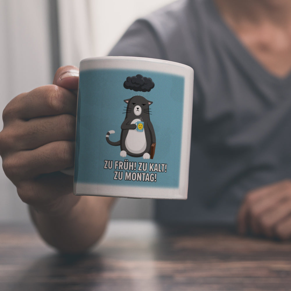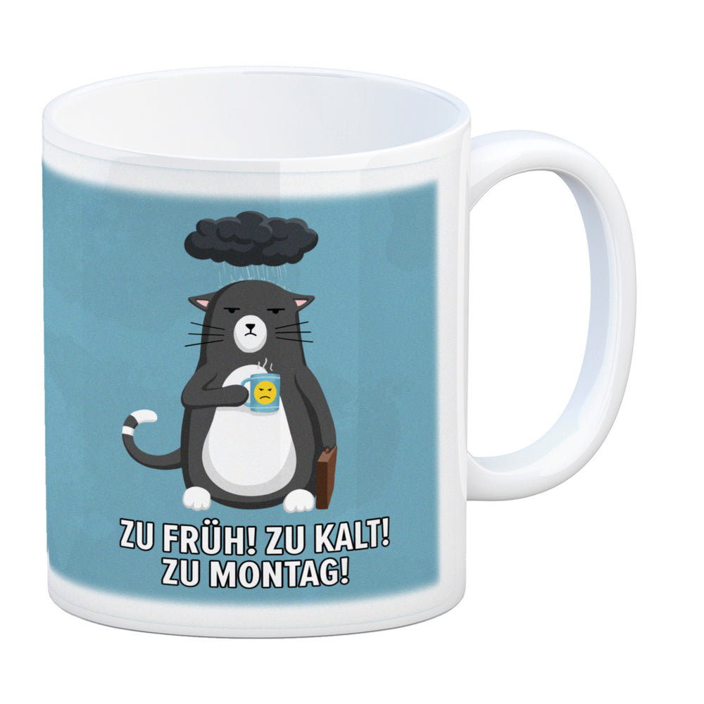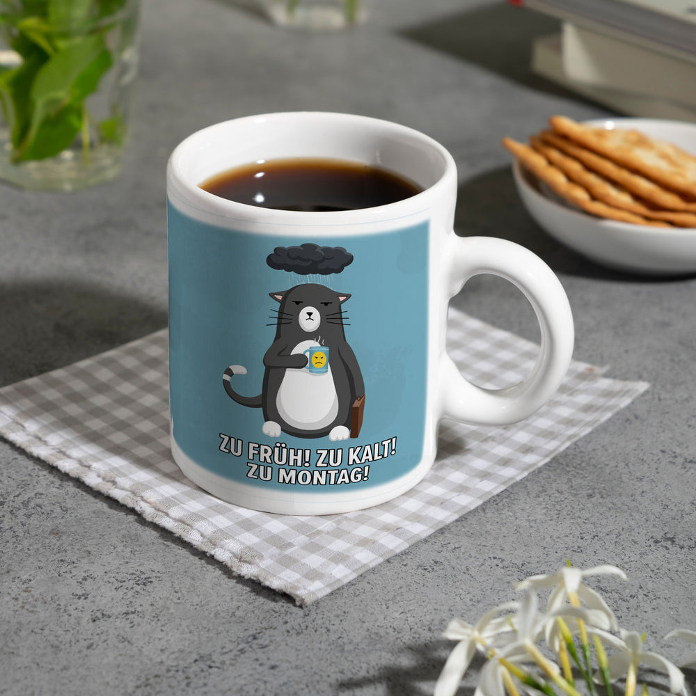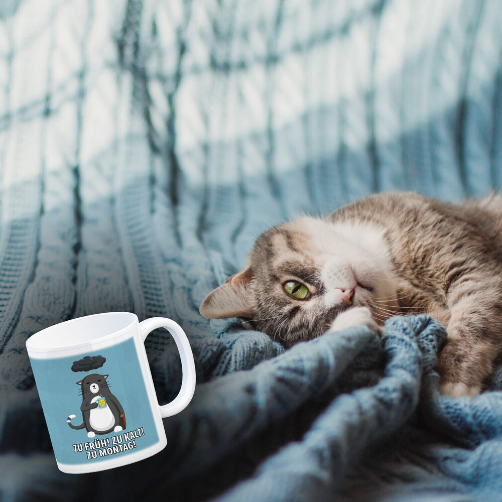 • 1x Zu früh, zu kalt, zu Montag witziger Kaffeebecher mit genervter Katze in der gewählten Ausführung