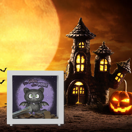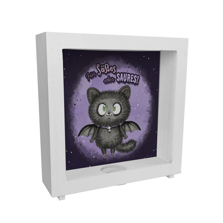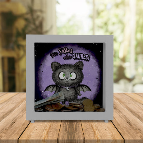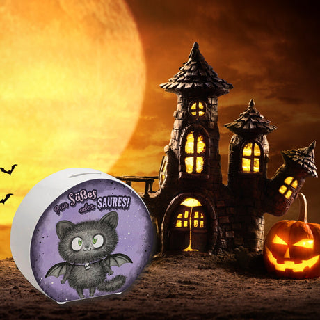 Schwarze Fledermaus-Katze Spardose mit Spruch Für Süßes oder Saures