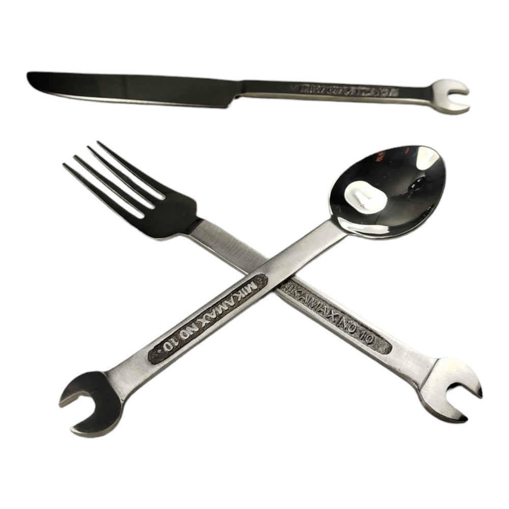 - 1x Schraubenschlüssel Besteck Set Werkzeug Essbesteck mit Geschenkbox aus Metall bestehend aus 1x Geschenkbox, 1x Gabel, 1x Löffel und 1x Messer.