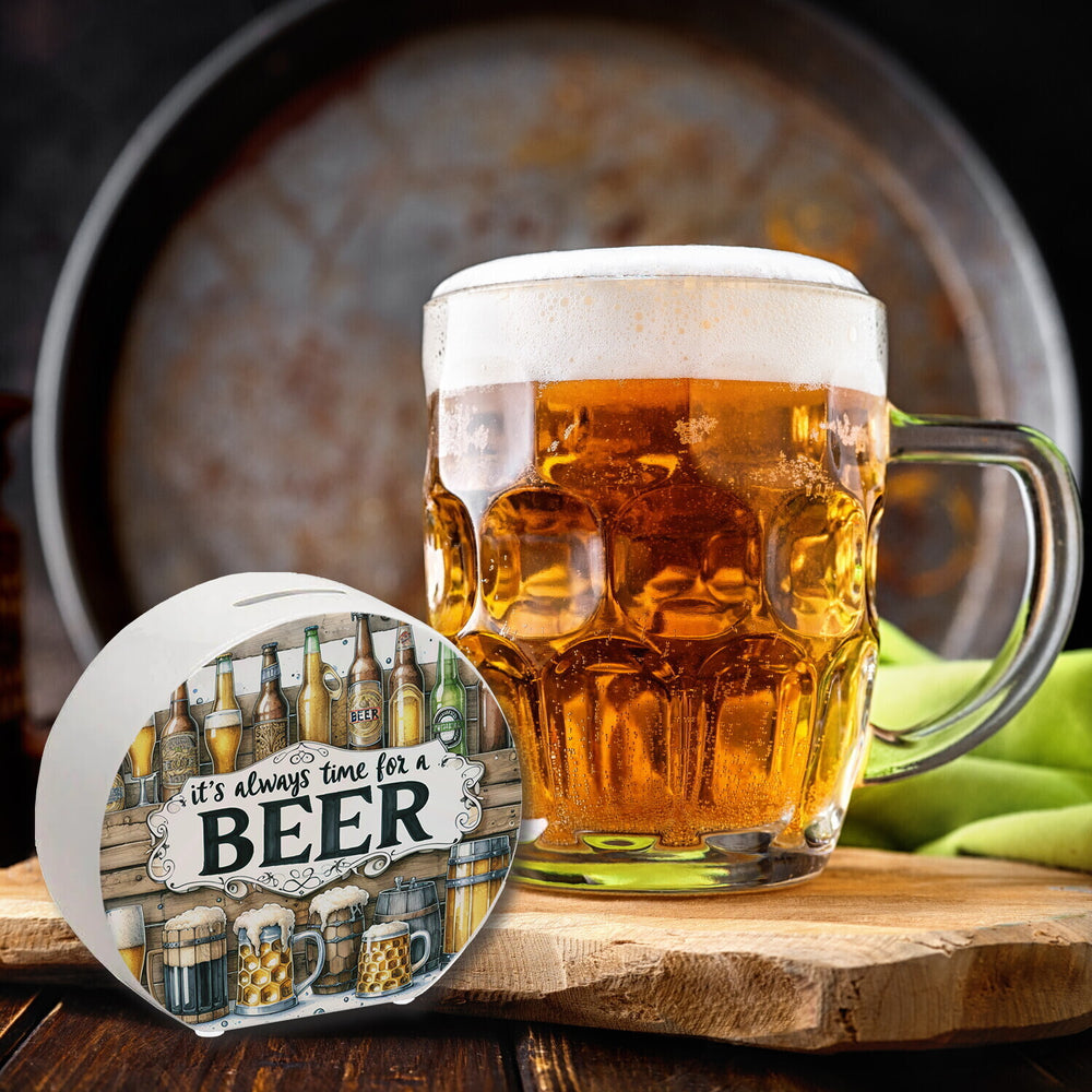 - Liebhaber von Bier und Spaß aufgepasst! Unsere Bier-Spardose mit dem frechen Spruch „It’s always time for a Beer“ ist das perfekte Accessoire für eure man cave. Verschiedene Biere auf einem hölzernen Hintergrund machen sie zum ultimativen Highlight. Spart für euer nächstes Bier-Abenteuer stilvoll!