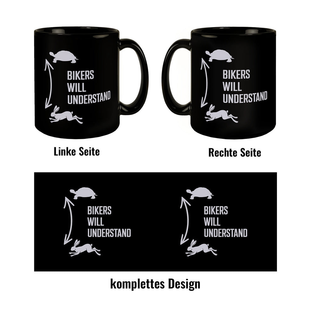 - Die "Bikers will understand" Tasse ist ein schwarzes Kunstwerk für Motorradfahrer. Mit einer lustigen Silhouette einer Schildkröte oben und einem rennenden Hasen unten, garniert mit einem geschwungenen Doppelpfeil. In silberner Schrift prangt der humorvolle Spruch, der Motorradfahrer zum Schmunzeln bringt.