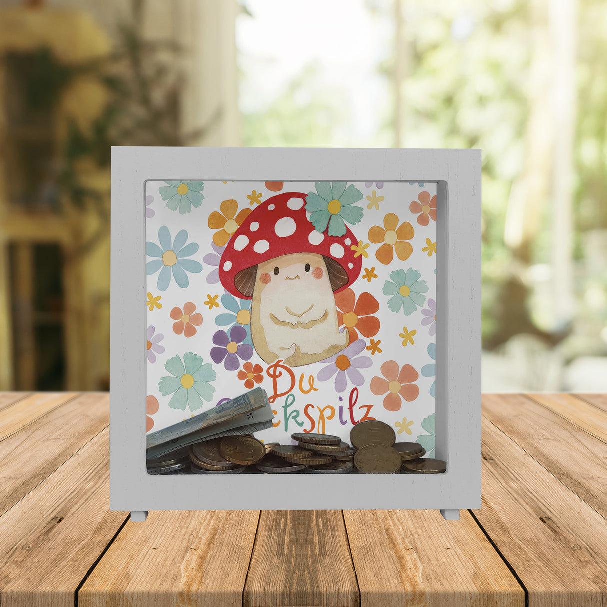 Hast du auf der Suche nach einem süßen Geschenk, das gleichzeitig eine sinnvolle Aufgabe erfüllt? Dann ist unsere Spardose Du Glückspilz genau das Richtige für dich! Diese charmante Spardose ist in drei verschiedenen Varianten erhältlich - als schlichtes Holz, als ovale Keramik-Version oder als exklusive Rahmen-Variante aus Holz mit Sichtfenster. Jede Spardose wurde mit viel Liebe in unserer Manufaktur bedruckt und verziert. Mit ihrem niedlichen Pilzgesicht und den bunten Blumen ist sie ein absoluter Hingucker und ein wahrer Glücksbringer im Kinderzimmer. Sie dient nicht nur als dekoratives Element, sondern hilft auch dabei, den Wert des Sparens zu verstehen und anzuerkennen. Überrasche deinen kleinen Glückspilz mit dieser besonderen Spardose und bereite ihm Freude über viele Jahre hinweg! Egal ob Kindergeburtstag, Einschulung oder andere besondere Anlässe - die Spardose Du Glückspilz ist immer eine gute Idee.