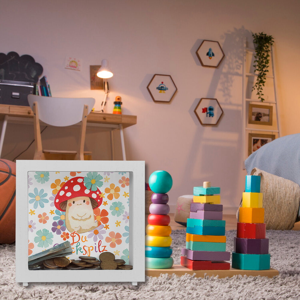 • Die Spardose ist ein echter Hingucker! Mit ihrem niedlichen Pilzgesicht und den bunten Blumen wirkt sie fröhlich und lebendig. Sie ist nicht nur ein dekoratives Element für jedes Kinderzimmer, sondern hilft auch dabei, den Wert des Sparens zu verstehen und anzuerkennen.