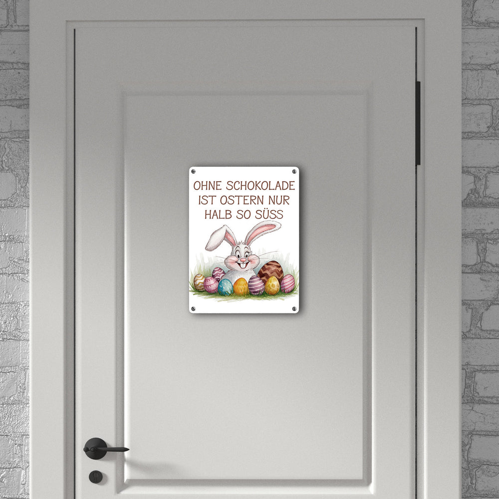 - Dieses Metallschild zeigt ein lustiges Osterdesign: Ein schelmisch lächelnder Hase, der aus einem halb aufgegessenen Schokoladenhasen hervorschaut, ist umgeben von bunten Ostereiern in Aquarell-Pastelloptik. Der Schriftzug "OHNE SCHOKOLADE IST OSTERN NUR HALB SO SÜSS" vervollständigt das fröhliche Festtagsmotiv.