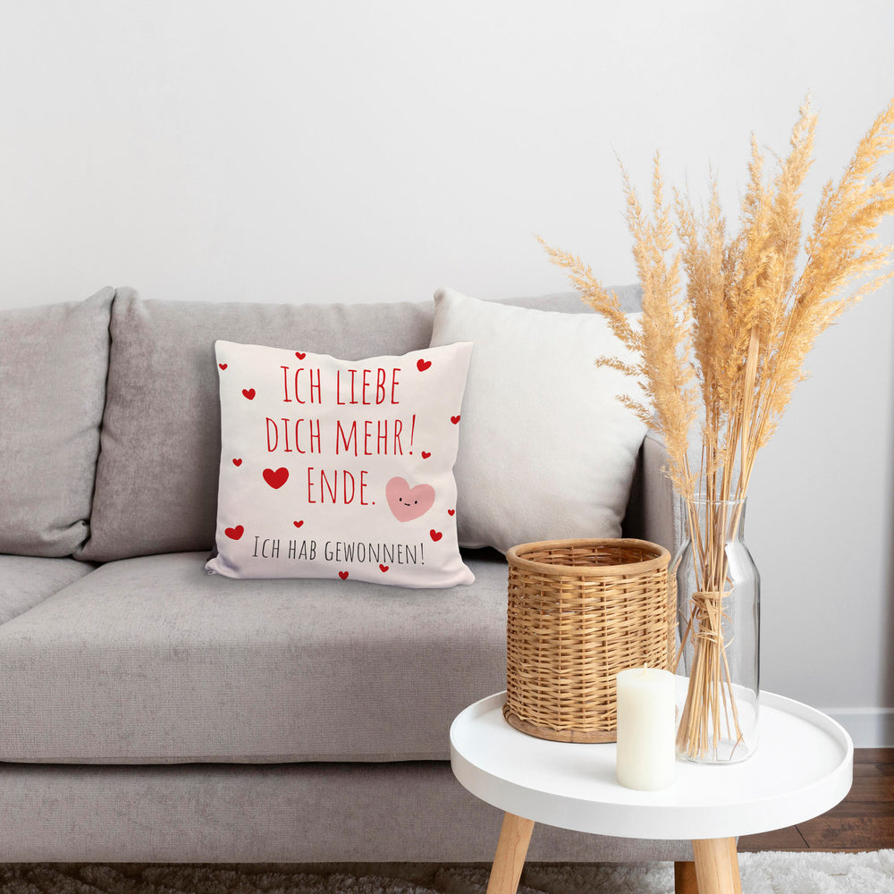 - 1x Herzen Kissen mit Spruch Ich liebe dich mehr! Ende. in der gewählten Ausführung