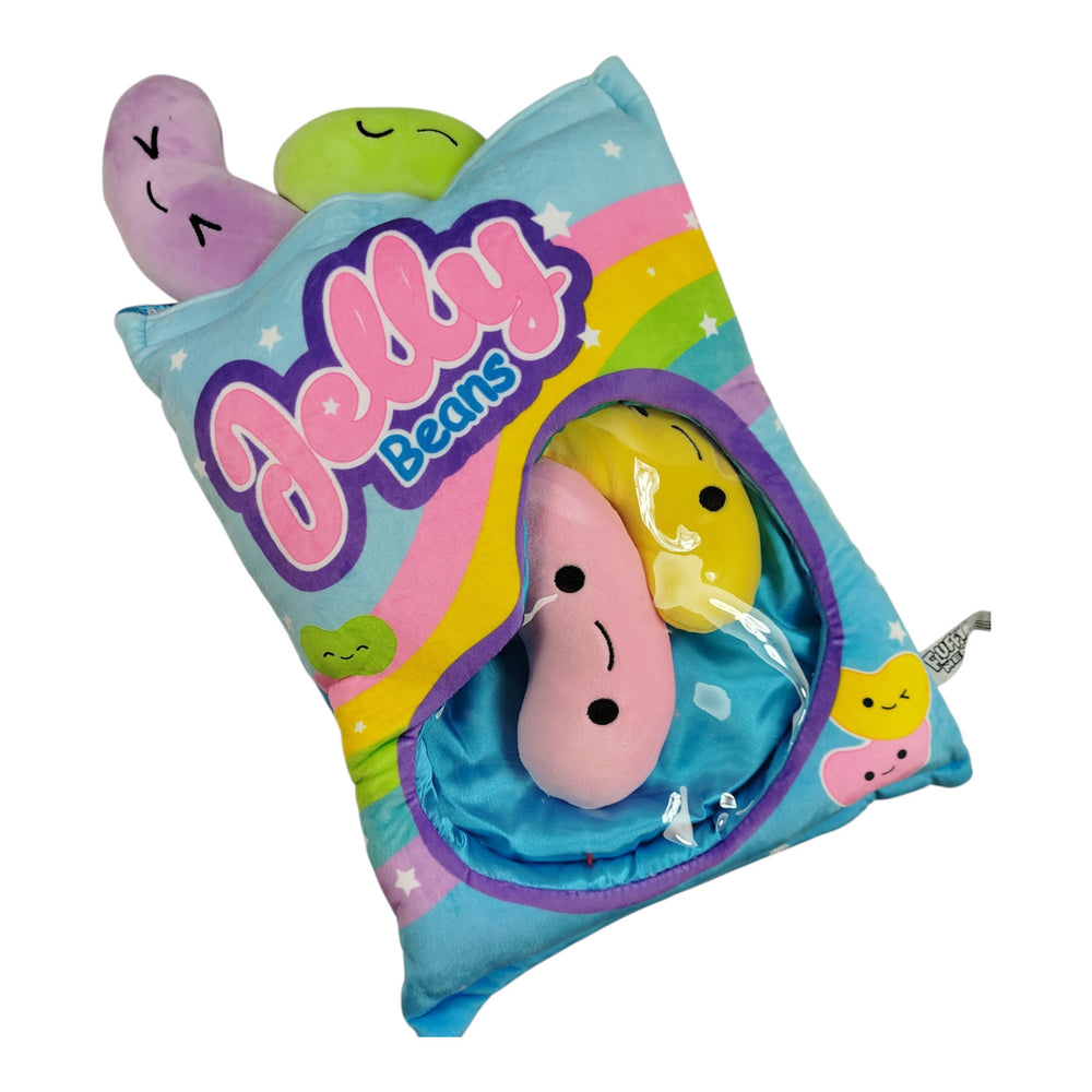 - Die Jelly Beans verstecken sich in einer Plüsch-Tüte, die wie eine echte Jelly Beans Verpackung aussieht! Öffne den Klettverschluss und entdecke die fünf bunten Plüsch-Jelly Beans mit ihren lustigen Gesichtern. Das Sichtfenster lässt einen Blick auf die bunten Bohnen zu und macht Lust auf mehr kuschelige Abenteuer!