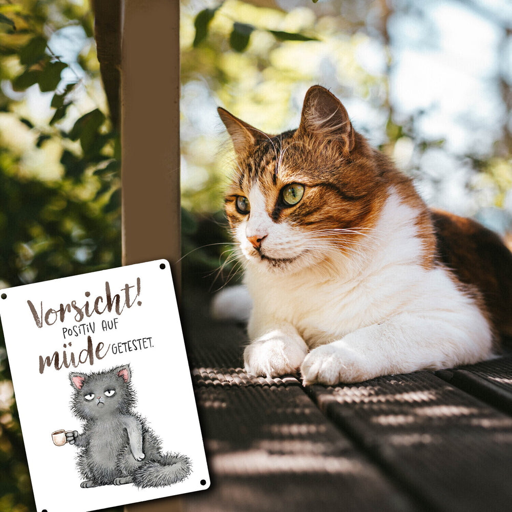 Katze Metallschild in 15x20 cm mit Spruch Vorsicht Positiv auf müde getestet