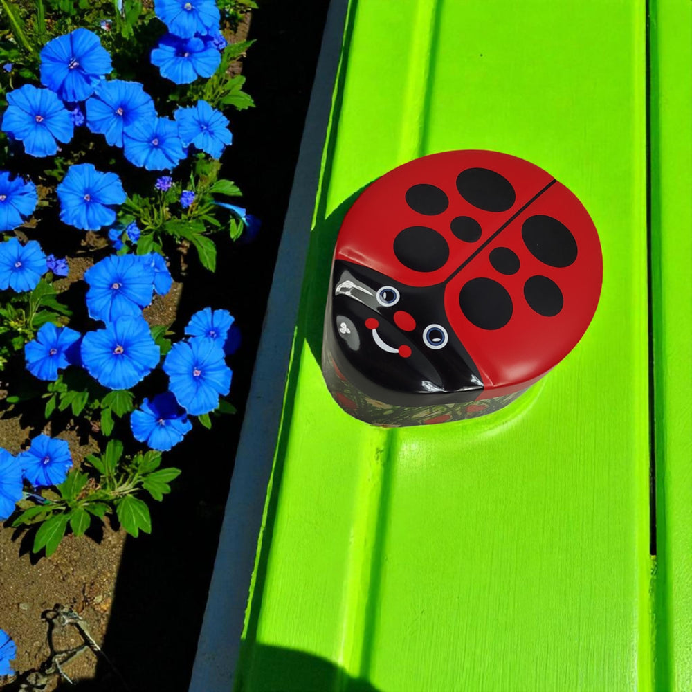 - Diese entzückende Metalldose besticht durch ihr unverwechselbares Design in Form eines Marienkäfers. Sie öffnet sich mittig und zieht mit ihrem rot-schwarzen Farbschema und dem seitlichen Blumenmuster alle Blicke auf sich. Die Flügel und das freundliche Gesicht auf der Oberseite runden das fröhliche Design ab.
