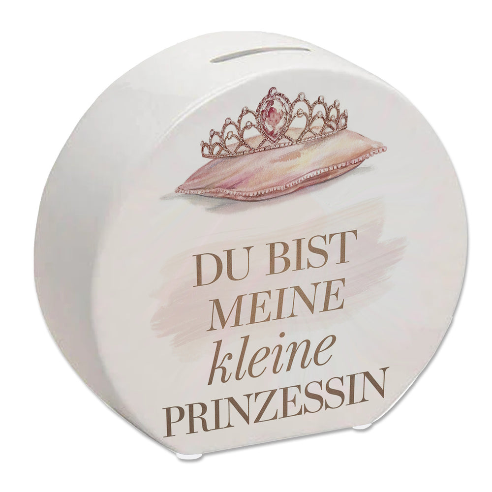 - Diese wunderschöne Spardose im ovalen Design besticht durch einen eleganten weißen Hintergrund und eine typografische Aquarell-Pastellgestaltung. Im Mittelpunkt thront eine zarte Tiara, geschmückt mit funkelnden Juwelen, auf einem weichen, pastellrosa Kissen. Der liebevolle Spruch "Du bist meine kleine Prinzessin" vollendet das Design in goldenen und rosa Schriftarten.