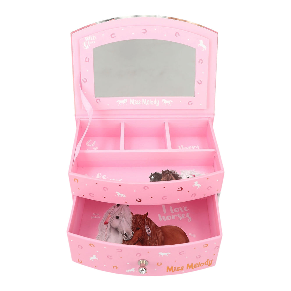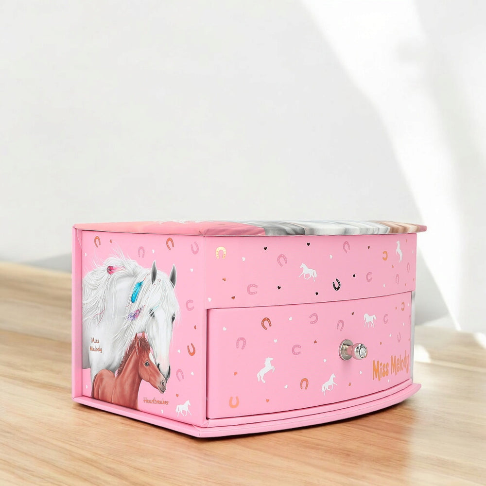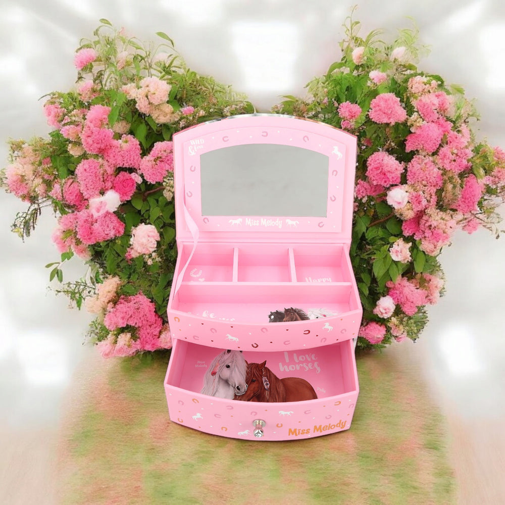 - Braucht Ihr kleiner Schatz eine magische Lösung zur Schmuckaufbewahrung? Mit dem Miss Melody Pferde Schmuckkästchen wird Schmuck organisieren kinderleicht! Ideal für pferdebegeisterte Mädchen, bewahrt es Ohrringe, Ringe und Armbänder sicher auf und setzt gleichzeitig einen trendigen Akzent im Kinderzimmer.