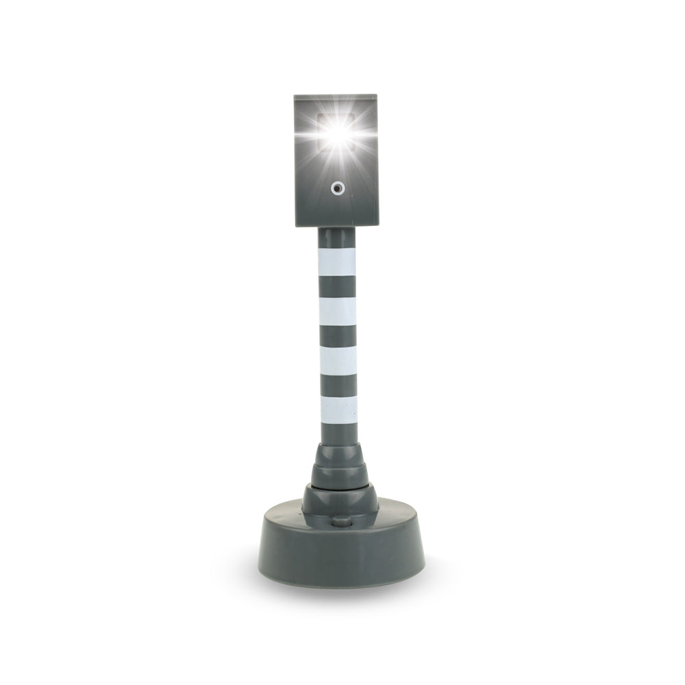 - Stilvoll in grau und weiß, täuschend echt wie eine Radarfalle. Der Blitzer kommt mit einer LED, die bei Knopfdruck aufleuchtet, und einem klassischen Blitzergeräusch. Einfach auf den Sockel drücken und schon schnappt die Falle zu - die perfekte Ergänzung für jeden Autoteppich im Spielzimmer!