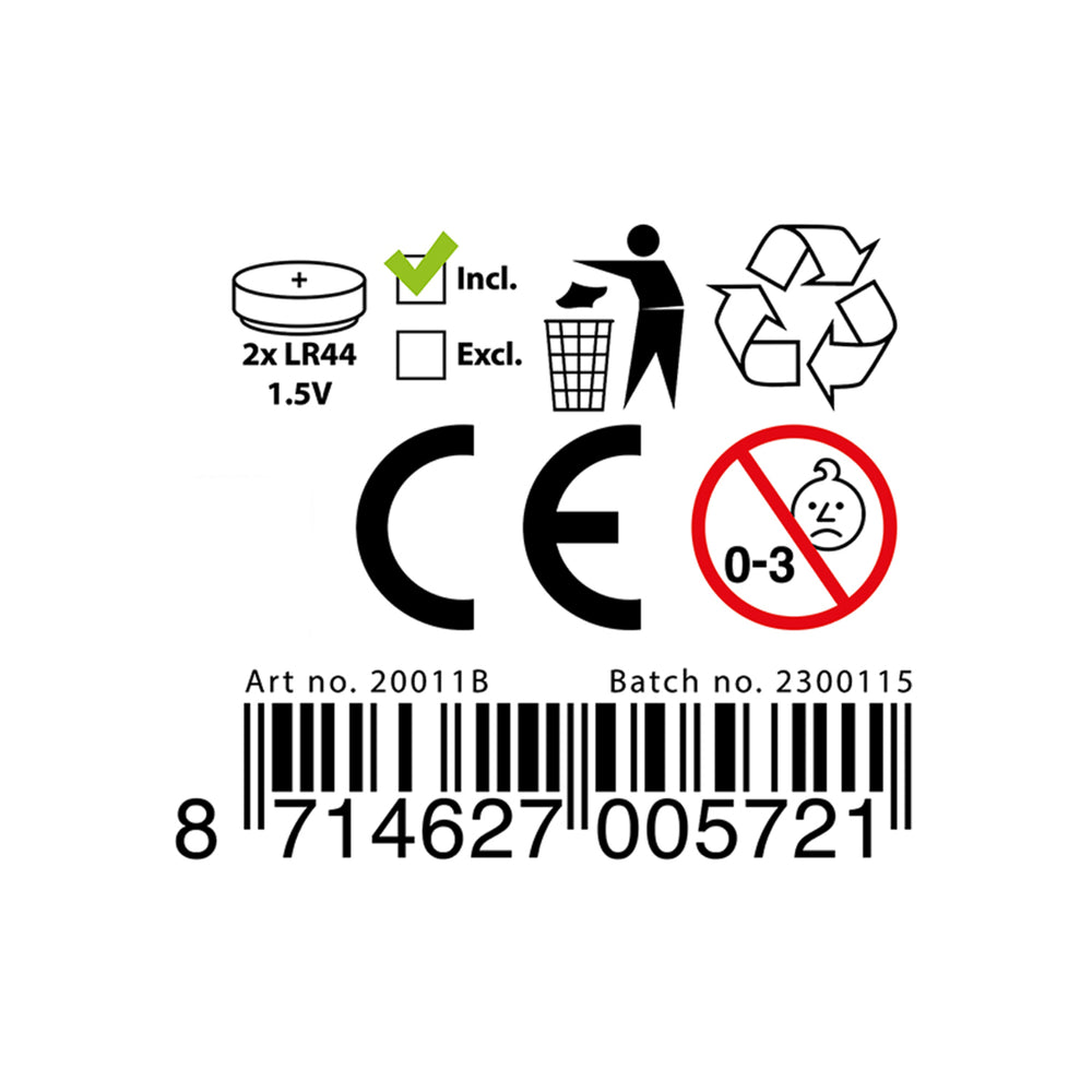 - Material: Kunststoff, Höhe: ca. 14,5cm , Hinweise: Zum Betrieb werden 2 x Knopfzelle(n) (LR44), benötigt. (Batterien nur zu Testzwecken enthalten). Achtung: Nicht für Kinder unter 36 Monaten geeignet! Vorsicht vor verschluckbaren Kleinteilen!