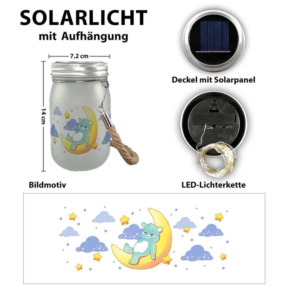 • Unser Solarlicht ist ein echter Hingucker! Ein süßer Bär, der auf einem Mond schläft, zaubert ein Lächeln auf jedes Gesicht. Wähle zwischen blauem oder rosa Bär und lass deinen Raum in sanftem Licht erstrahlen. Ideal für jedes Kinderzimmer und jeden, der das Besondere liebt.